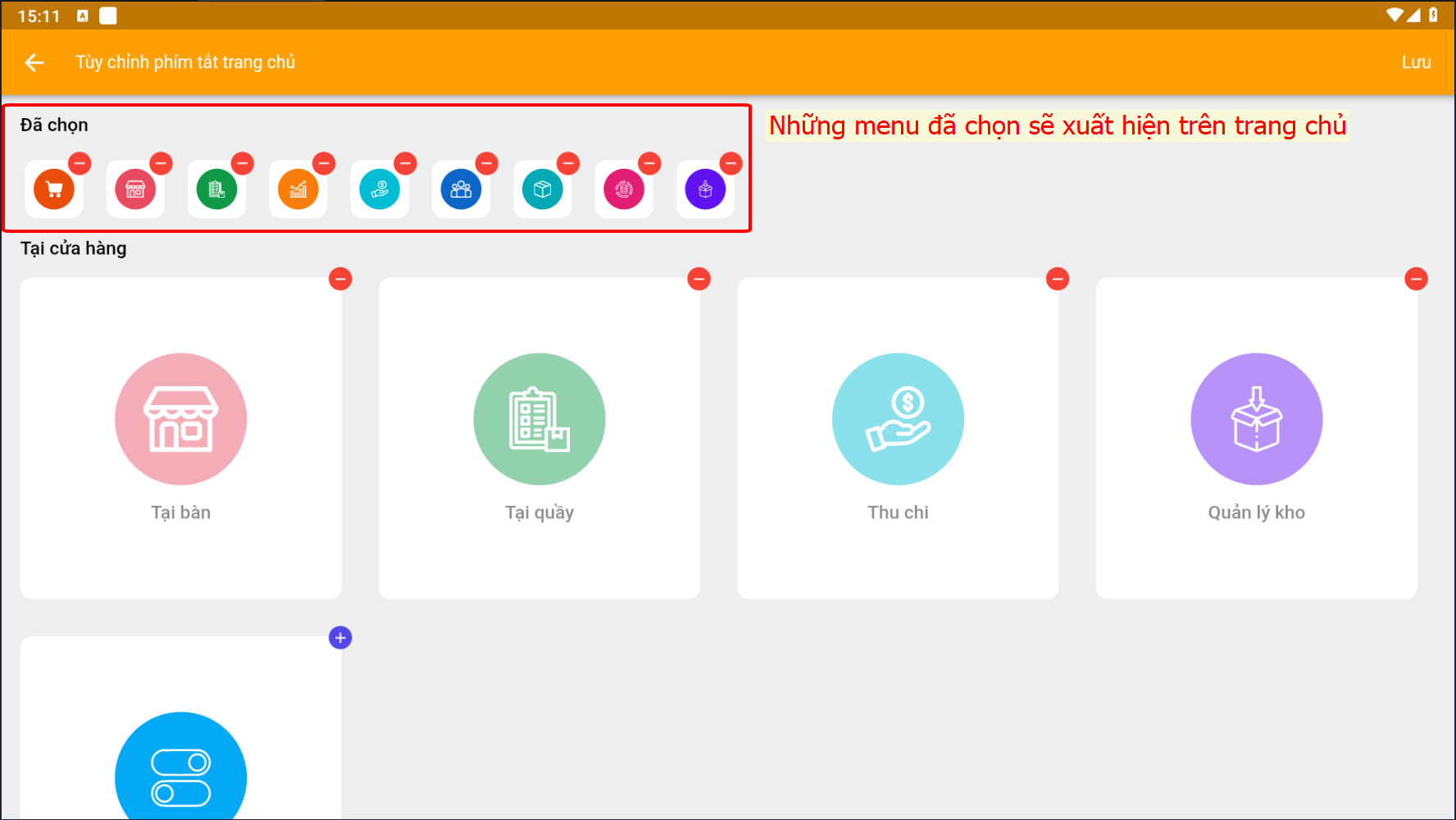 Những mục nào nằm dòng "đã chọn" sẽ nằm trên trang chủ giao diện chính