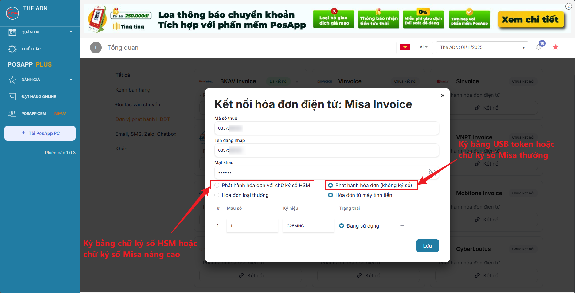 *<mark style="color:red;">**- Có thể dùng chữ ký số HSM, chữ ký số Misa, hoặc USB token**</mark>*\
