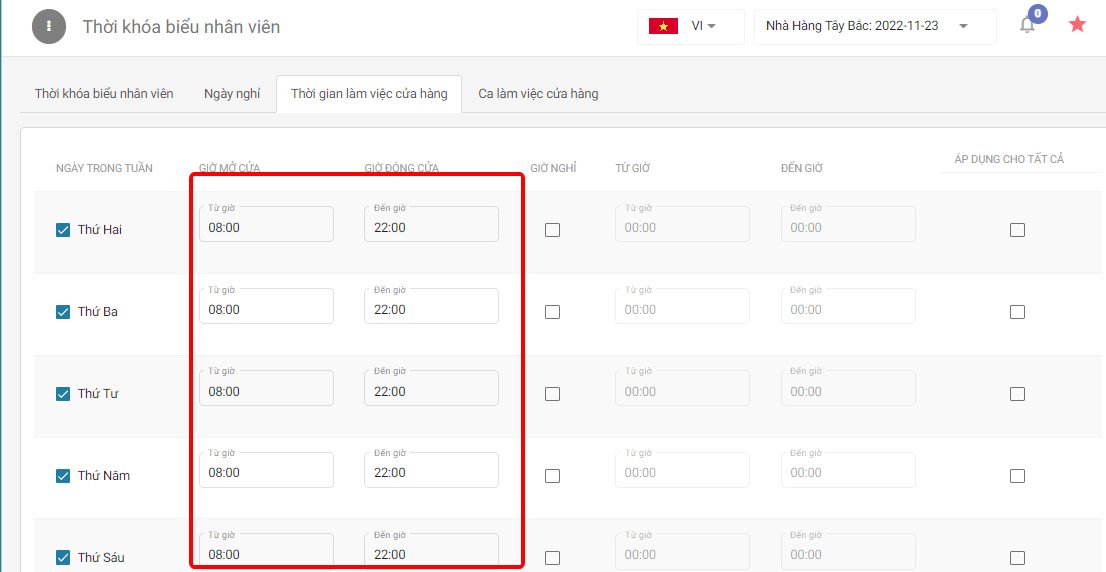 **Bước 1: Mở thiết thời gian cửa hàng**