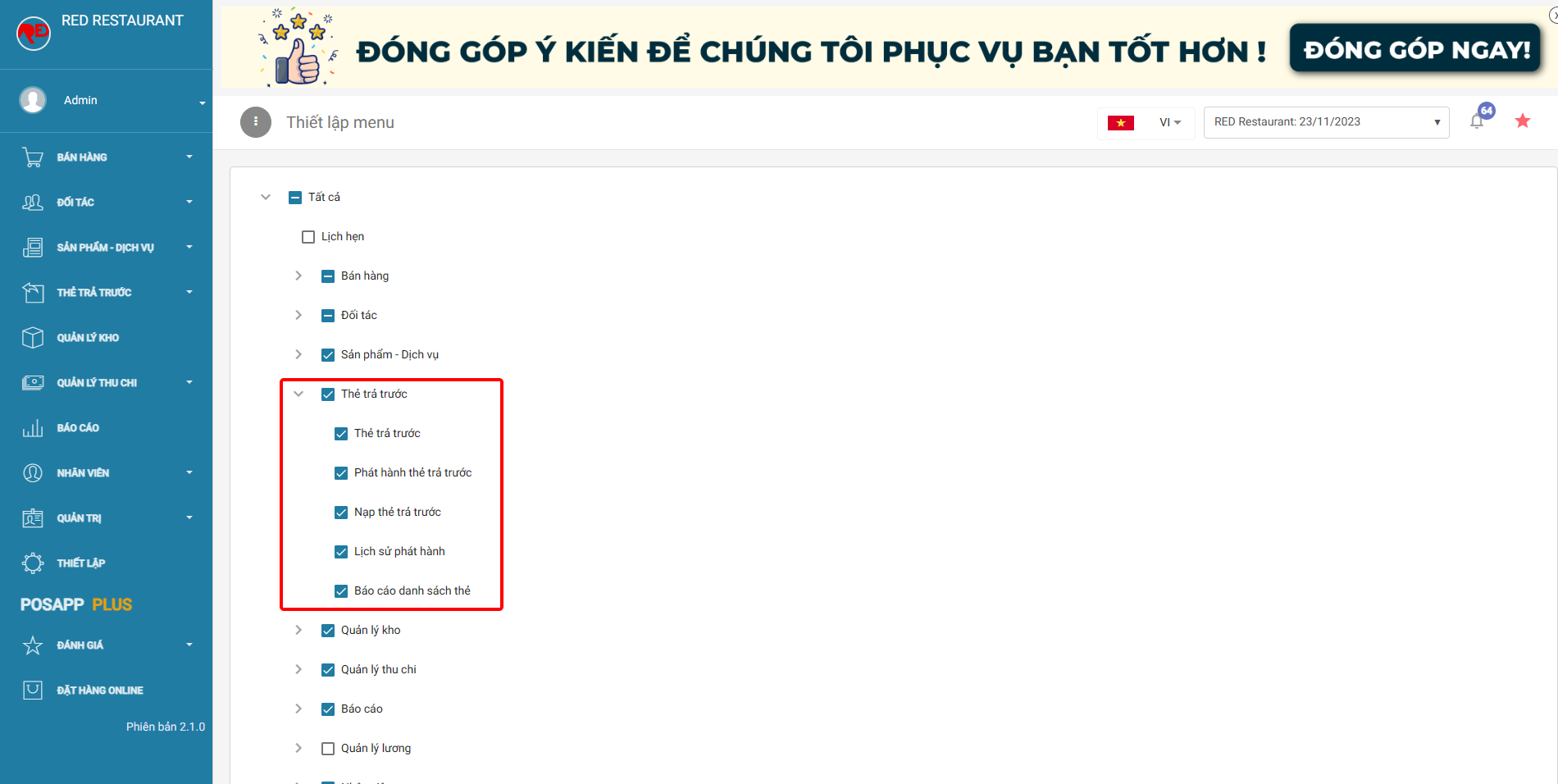 Bật các mục thẻ trả trước này > lưu lại