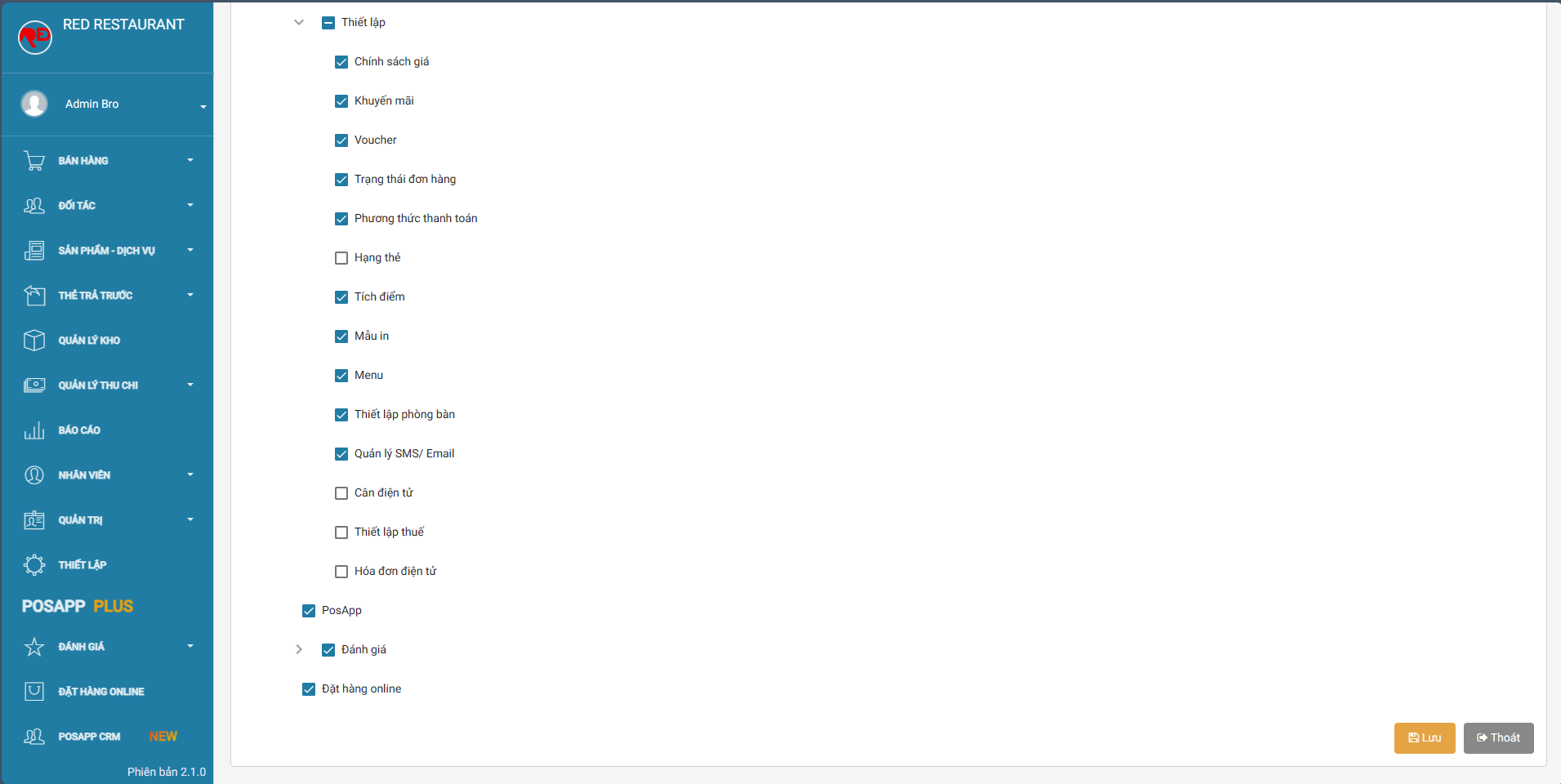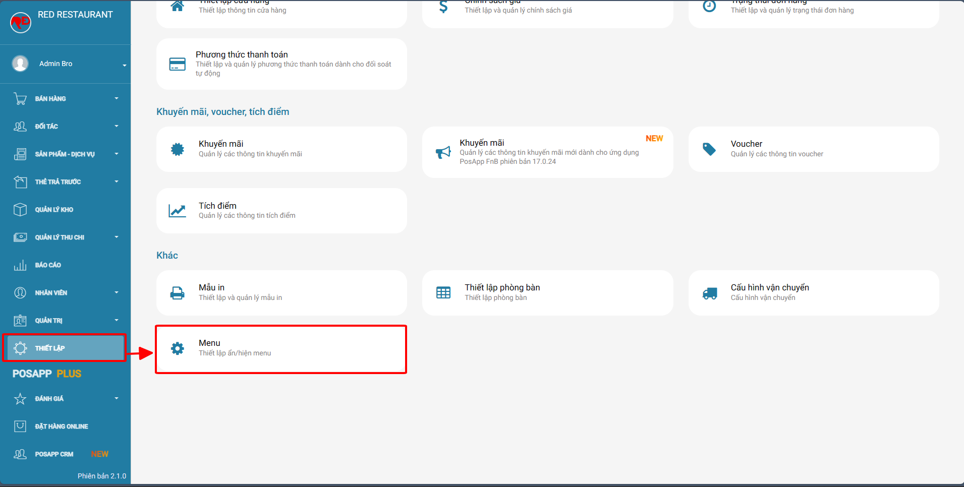Bước 1: Tại trang web Admin.posapp.vn chọn thiết lập > menu