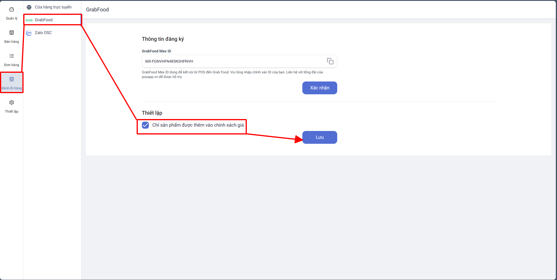 Vào đặt hàng online > Grab Food > tích vào ô "chỉ sản phẩn được thêm vào chính sách giá" > ấn đồng bộ > thành công\