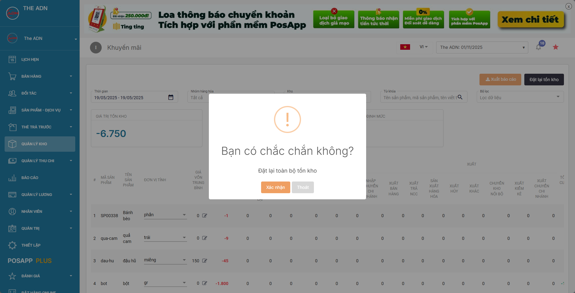 <mark style="color:red;">**Lưu ý: Khi thao tác đặt lại dữ liệu tồn kho của cửa hàng đồng nghĩa khách hàng đồng ý mọi điều khoản khi đặt lại dữ liệu kho của PosApp**</mark> \ <mark style="color:red;">1.  Đặt lại dữ liệu tồn kho sẽ xóa các phần liên quan tới tồn kho , không ảnh hưởng tới doanh thu bán hàng tước đó</mark>\ <mark style="color:red;">2. Xóa dữ liệu cần xác nhận lại mật khẩu và dùng tài khoản của chủ cửa hàng (tài khoản admin) và có xác nhận OTP gửi về mail đăng ký xác nhận xóa</mark>\ <mark style="color:red;">3. Dữ liệu xóa sẽ không thể khôi phục nên quý khách cần cân nhắc trước khi xóa</mark>