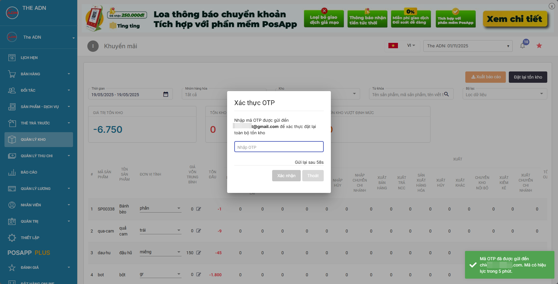 **Bước 5: Nhập mã OTP được gửi về mail đăng ký tải khoản để xác nhận đặt lại tồn kho**
