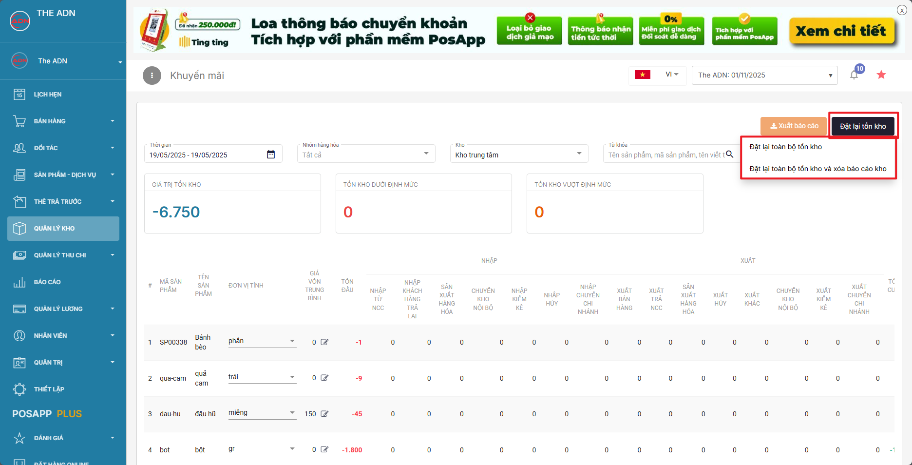\- Thao tác này có thể khiến anh/chị không thấy danh sách sản phẩm ở mục tồn kho do dữ liệu về 0 rồi nên sẽ ko hiện. anh/chị có thể nhập hàng bình thường