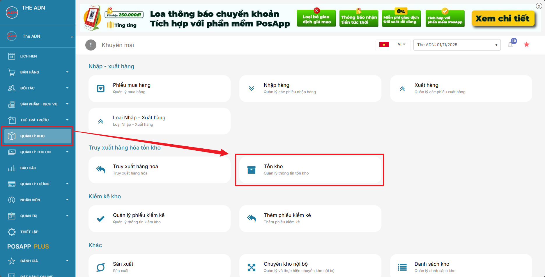 **Bước 2: Sau đó chọn Quản lý kho > tồn kho**
