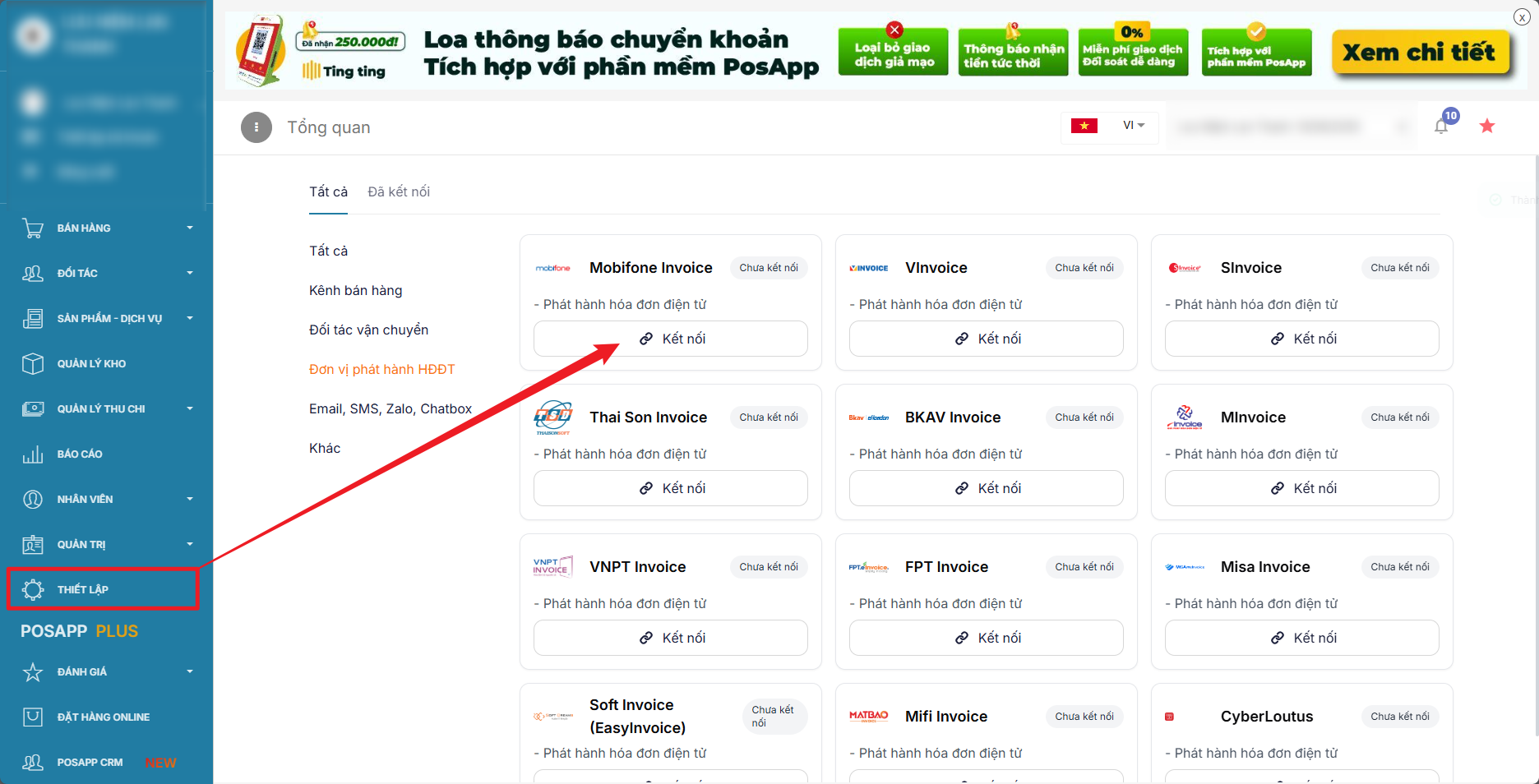**Bước 2: Chọn thiết lập > Hóa đơn điện tử**