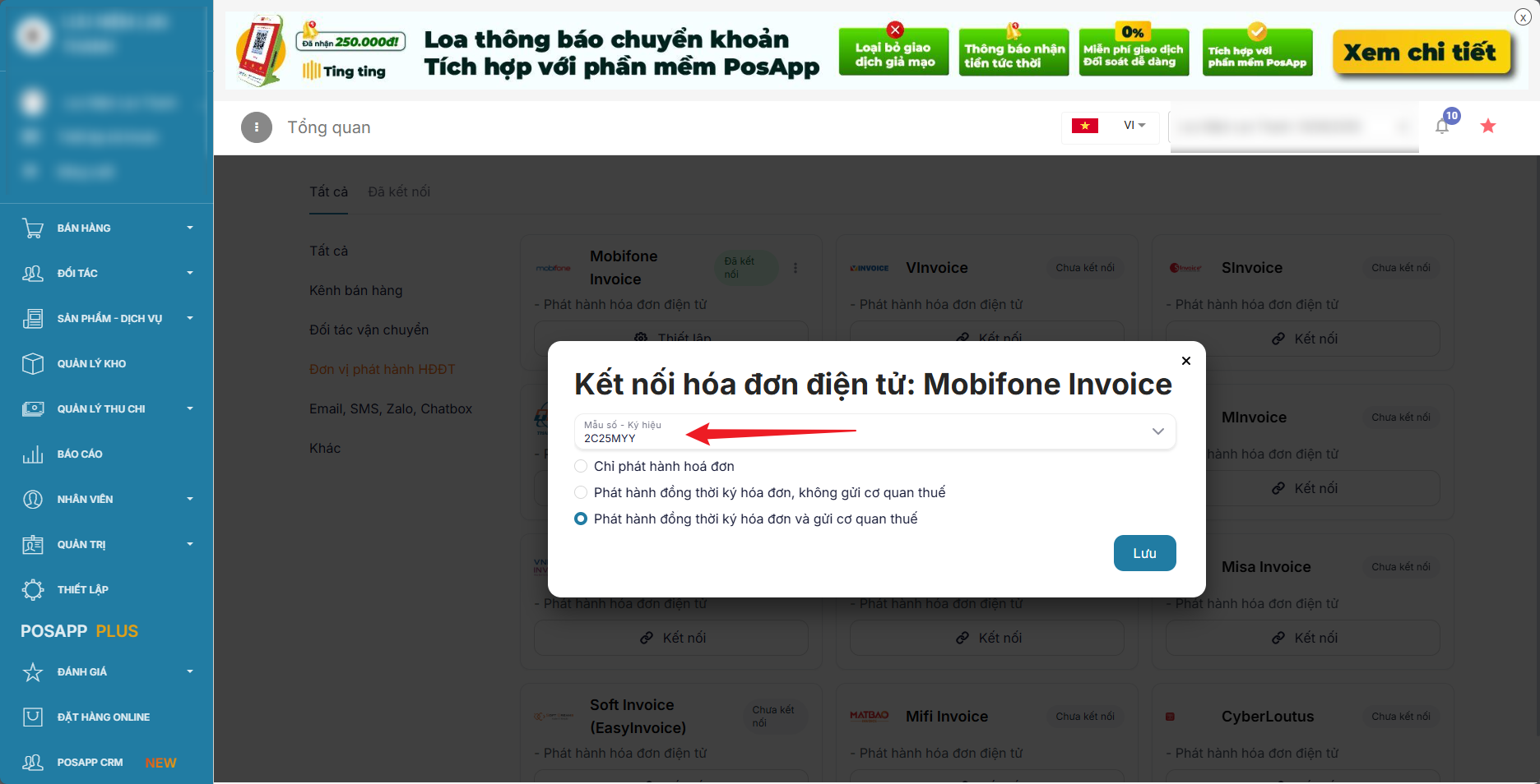 <mark style="color:red;">- Chỉ phát hành hoá đơn (không ký, không gửi cơ quan thuế, khách phải tự thao tác ký và gửi)</mark>\ <mark style="color:red;">- Phát hành đồng thời ký hóa đơn, không gửi cơ quan thuế</mark>\ <mark style="color:red;">- Phát hành đồng thời ký hóa đơn và gửi cơ quan thuế</mark>
