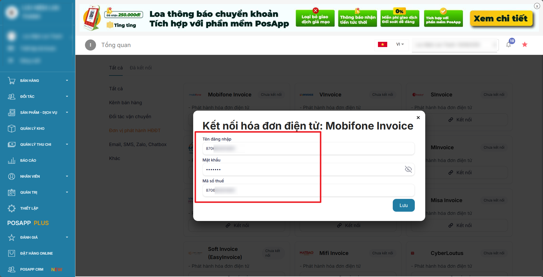 **Bước 4: Điền tên đăng nhập/mã số thuế/mật khẩu của bên Mobifone để kết nối**