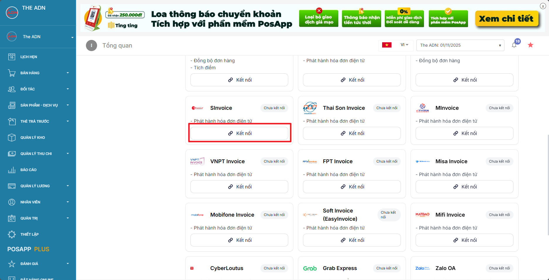 **Bước 3: Tìm tới mục SInvoice (Viettel) ấn kết nối**