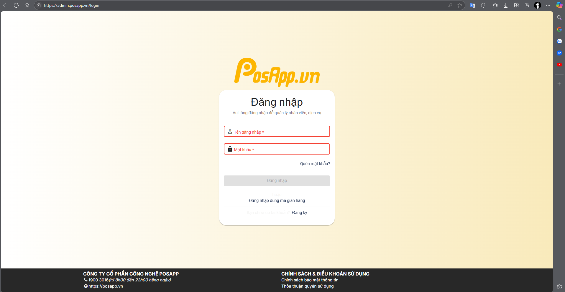 **Bước 1: Truy cập trang quản trị** [**admin.Posapp.vn**](https://admin.posapp.vn/) **tiến hành đăng nhập**