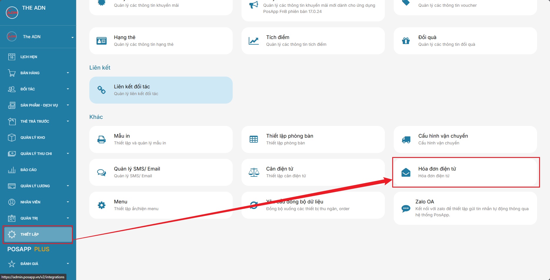 **Bước 2: Chọn thiết lập > Hóa đơn điện tử**