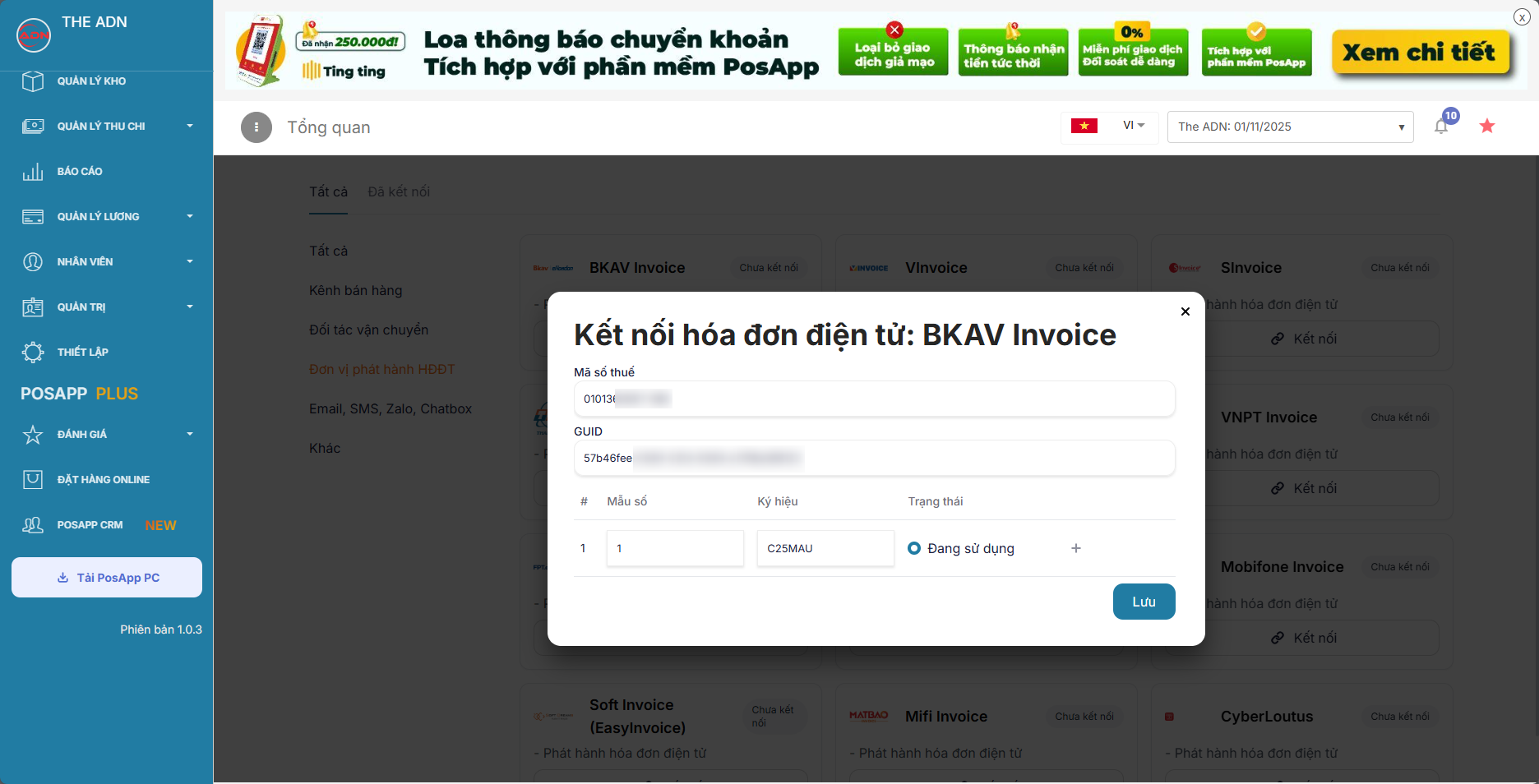 **Bước 4: Điền thông tin kết nối của BKAV Invoice**