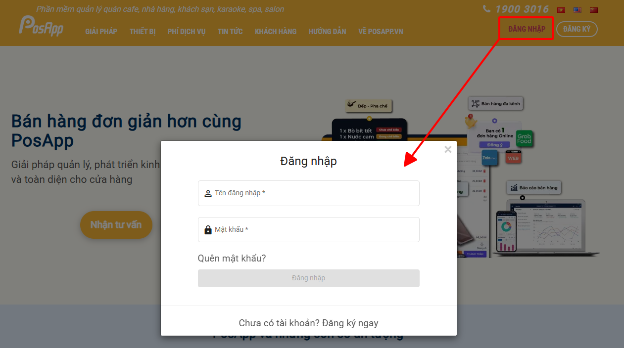 Truy cập [Posapp.vn](https://posapp.vn/) và chọn đăng nhập > điền thông tin đăng nhập