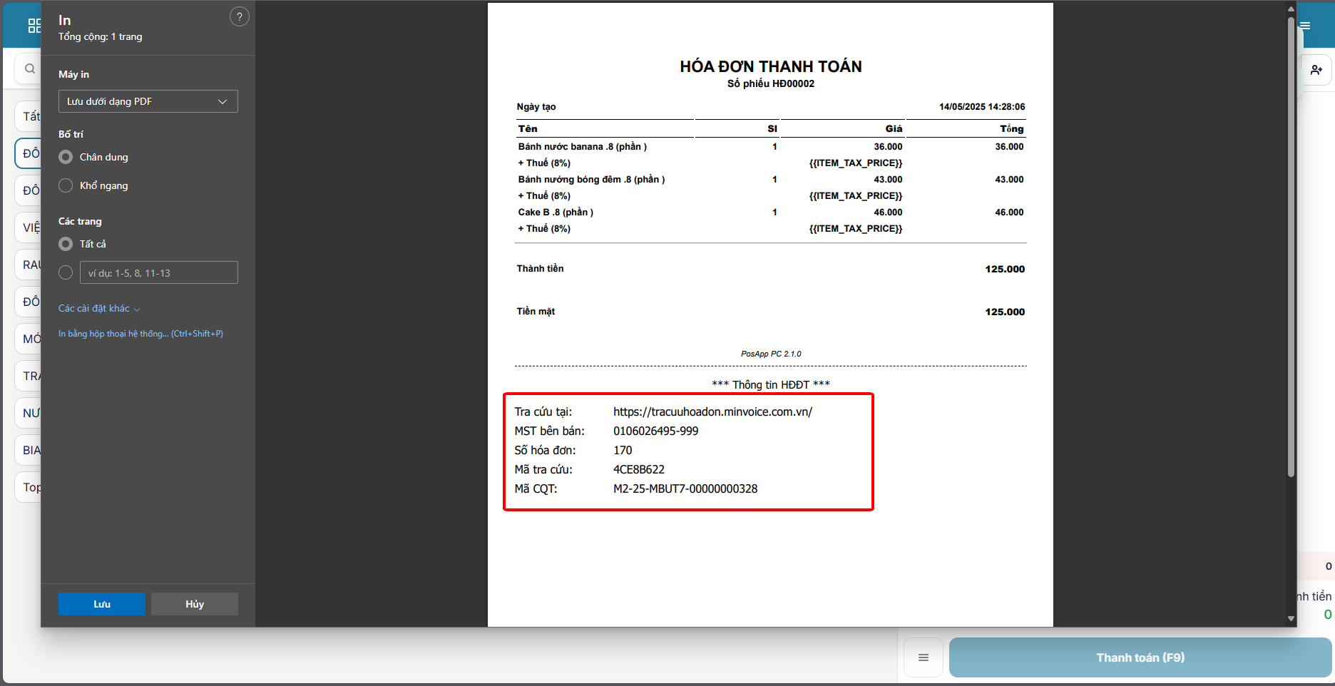 Màn hình in hóa đơn hiện ra, tiến hành in . Hóa đơn sẽ có thông tin tra cứu hóa đơn điện tử dành cho người mua