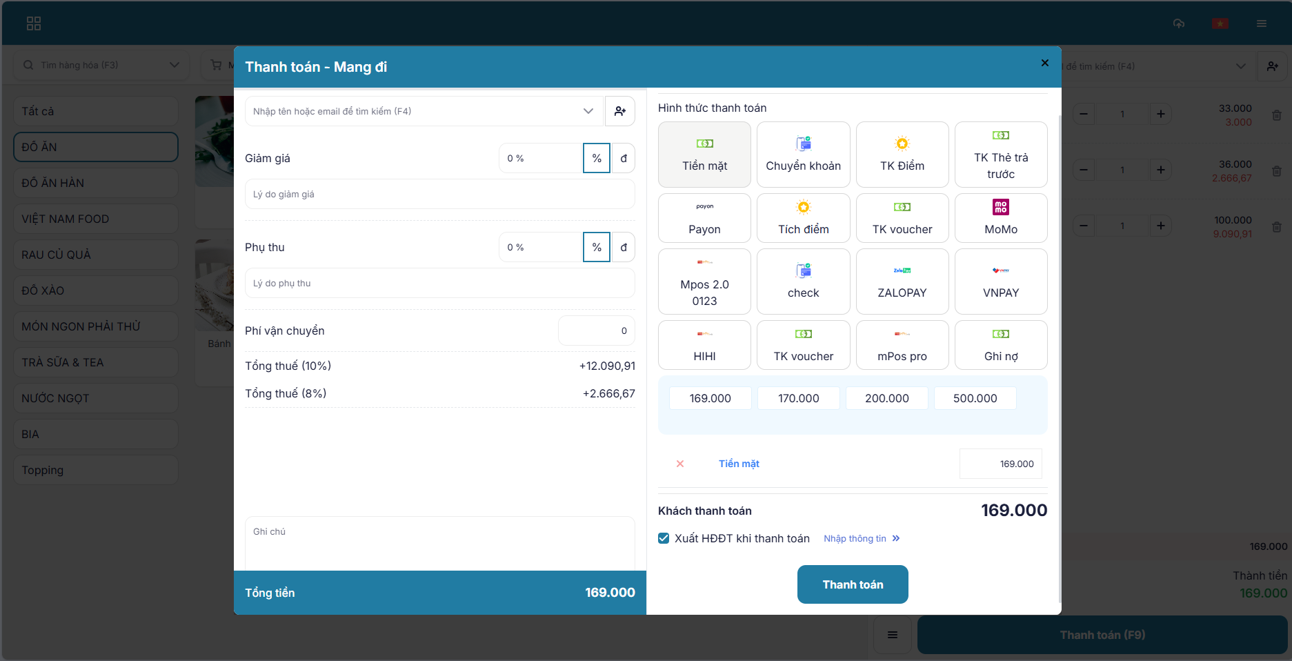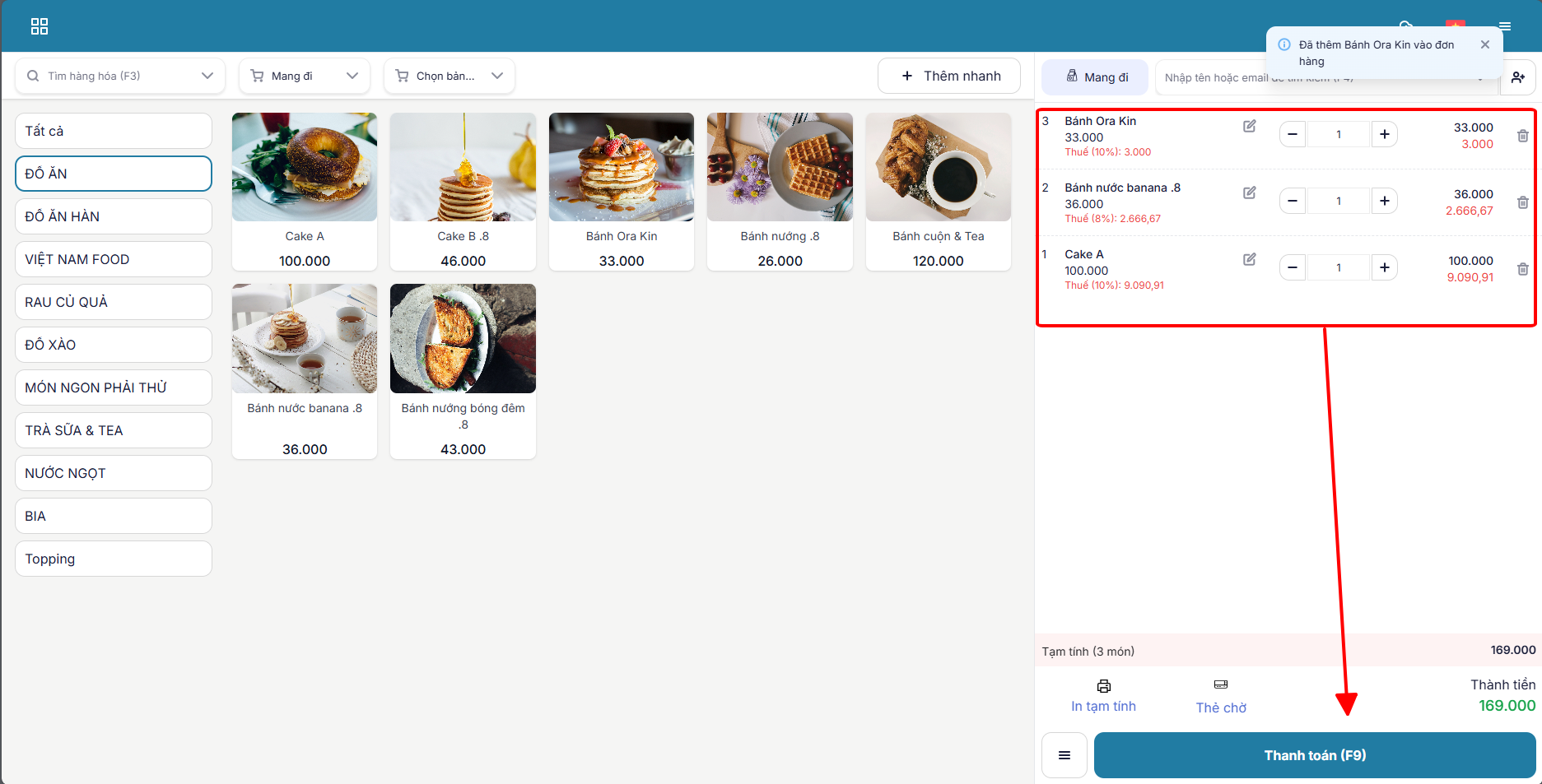Tại màn hình bán hàng tiến hành order sản phẩm như các đơn hàng thông thường sau đó chọn Thanh toán