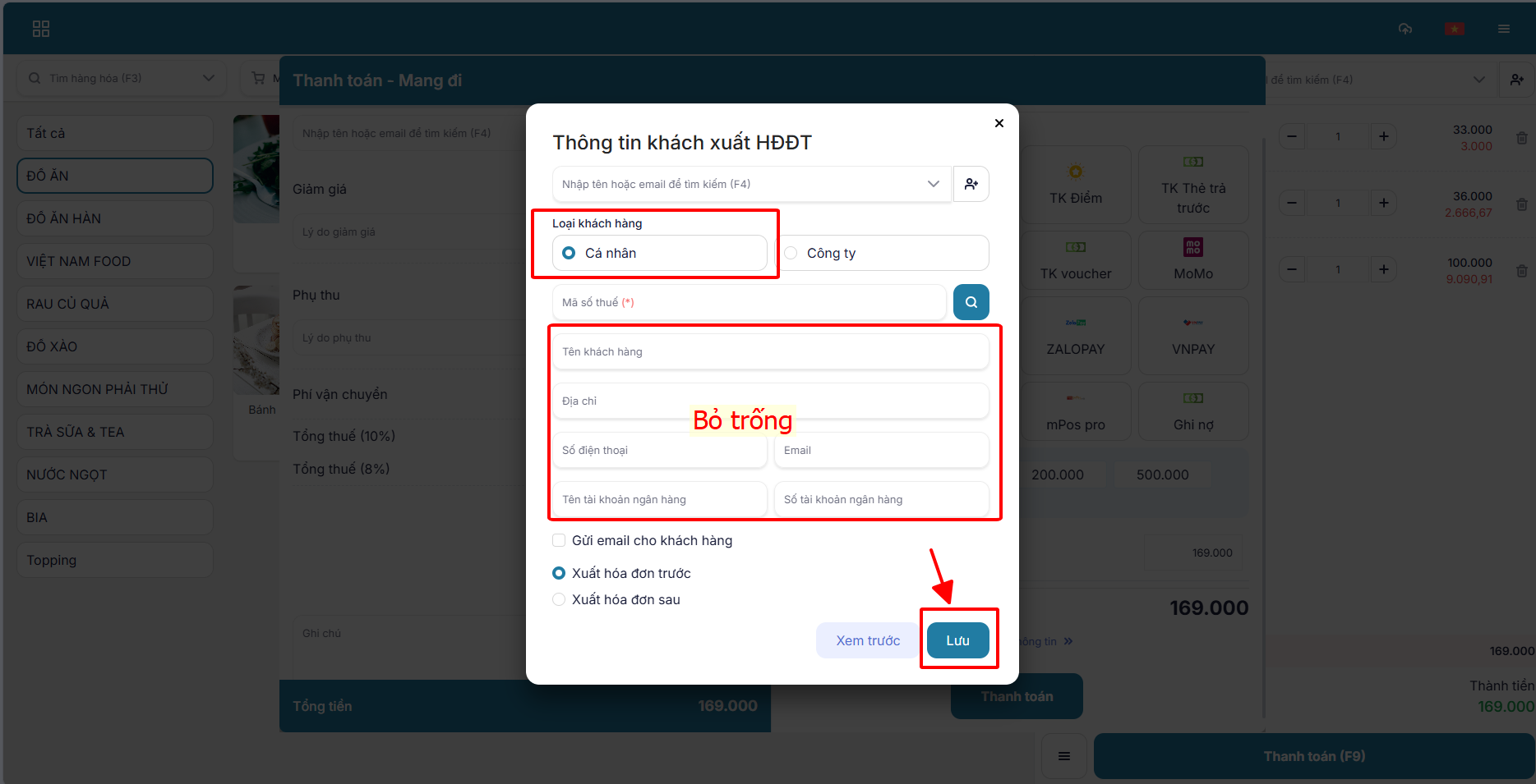 Lưu ý: Nếu muốn xuất cho khách lẻ thì chọn cá nhân sau đó để trống thông tin rồi bấm lưu