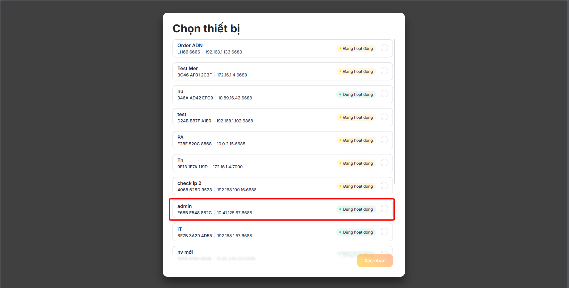 Tại màn hình chọn thiết bị bạn chọn 1 thiết bị bất kỳ (Ưu tiên thiết bị đang dừng hoạt động chưa ai sử dụng)