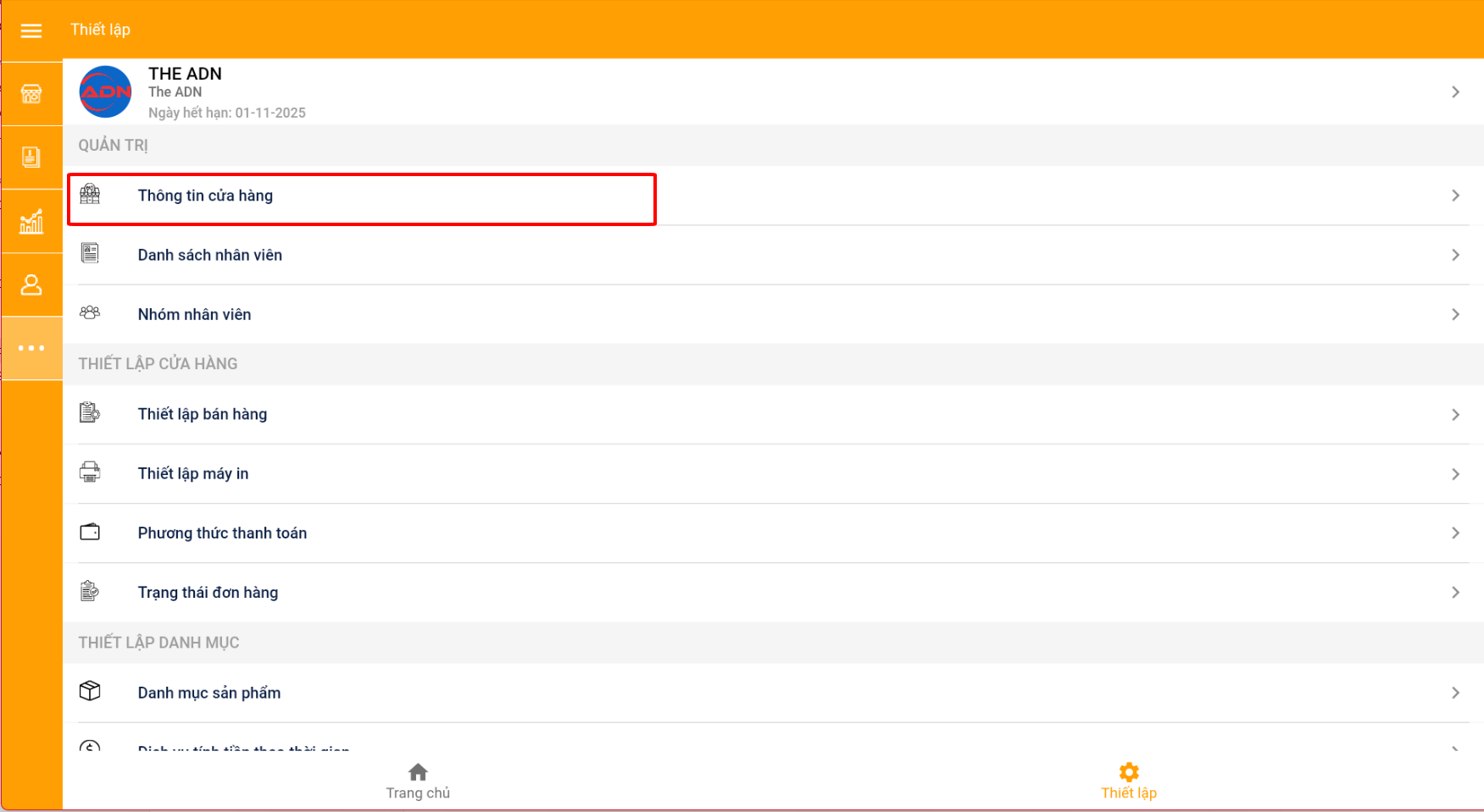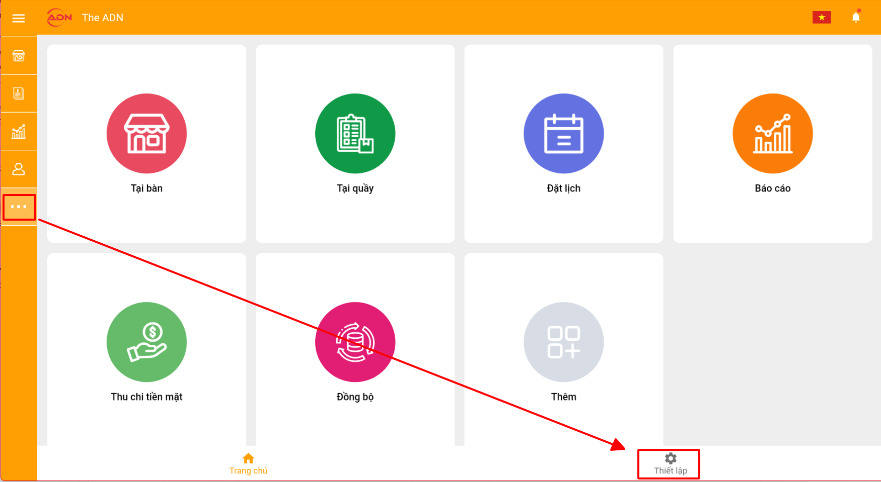 **Bước 1: Tại giao diện chính của máy thu ngân chọn dấu 3 chấm phí bên trái màn hình > chọn thiết lập**