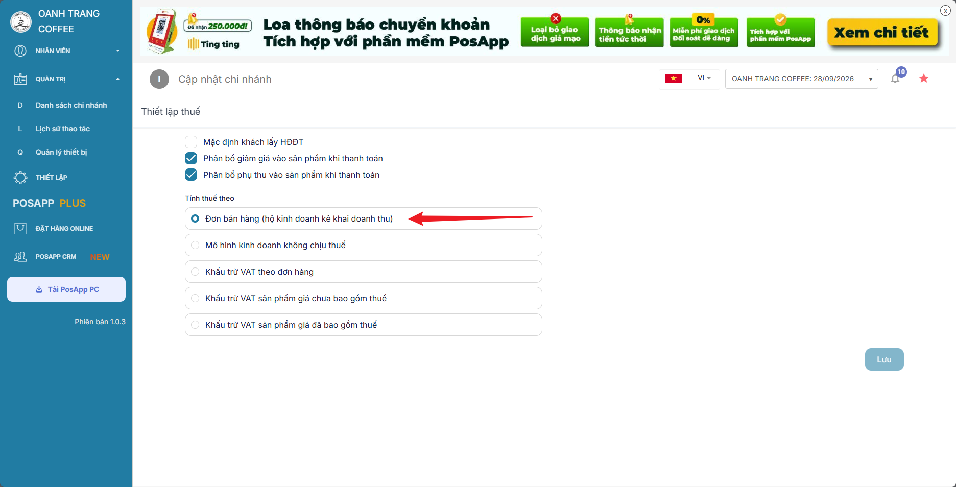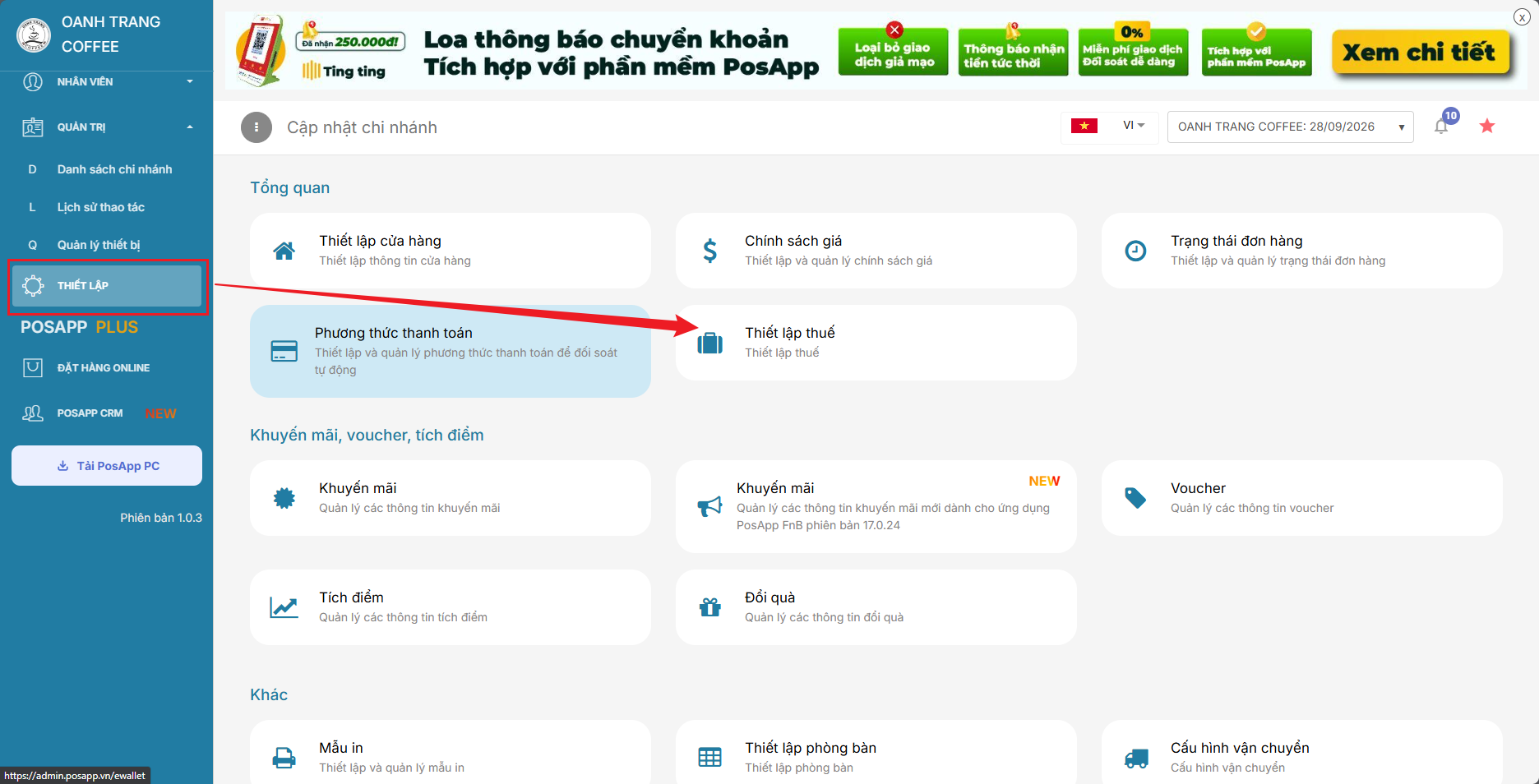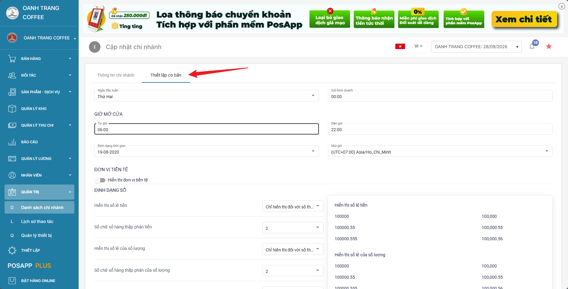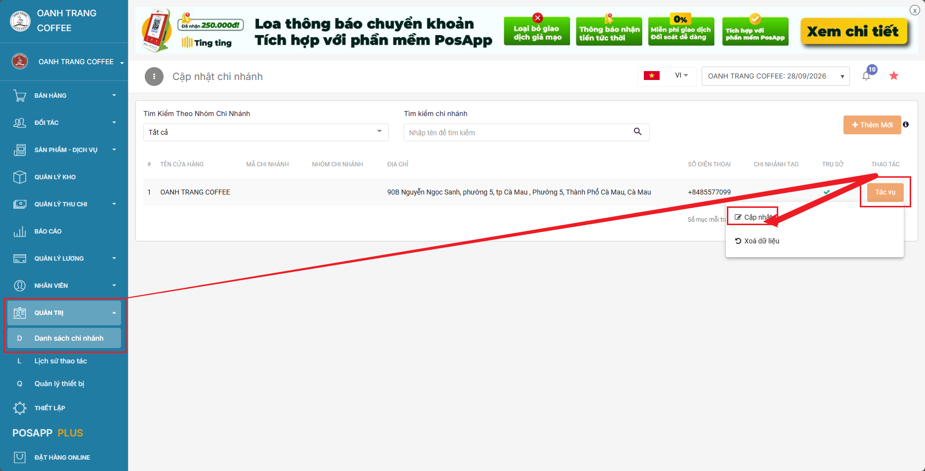 Vào quản trị > danh sách chi nhánh > tác vụ > cập nhật
