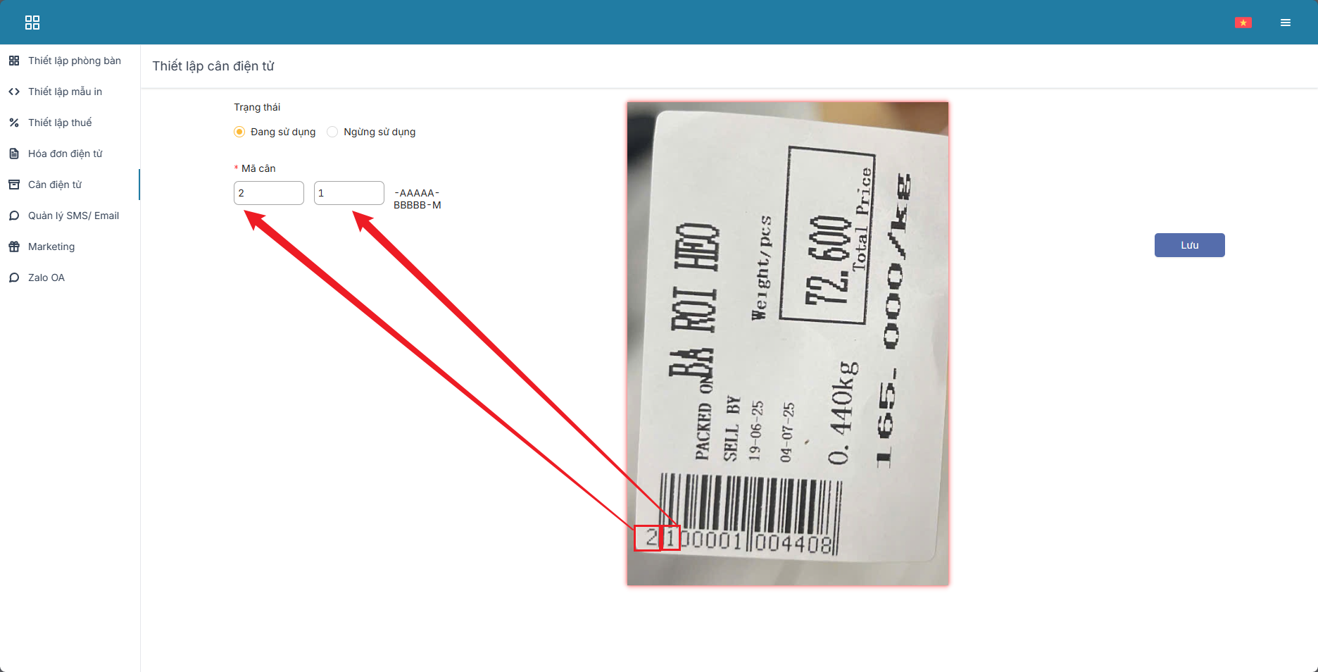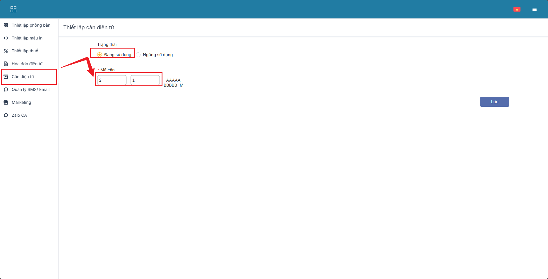 Bước 5: Chọn cân điện tử > tích vào ô sử dụng và điền mã cân (mã cân lấy từ cân) sau đó lưu lại