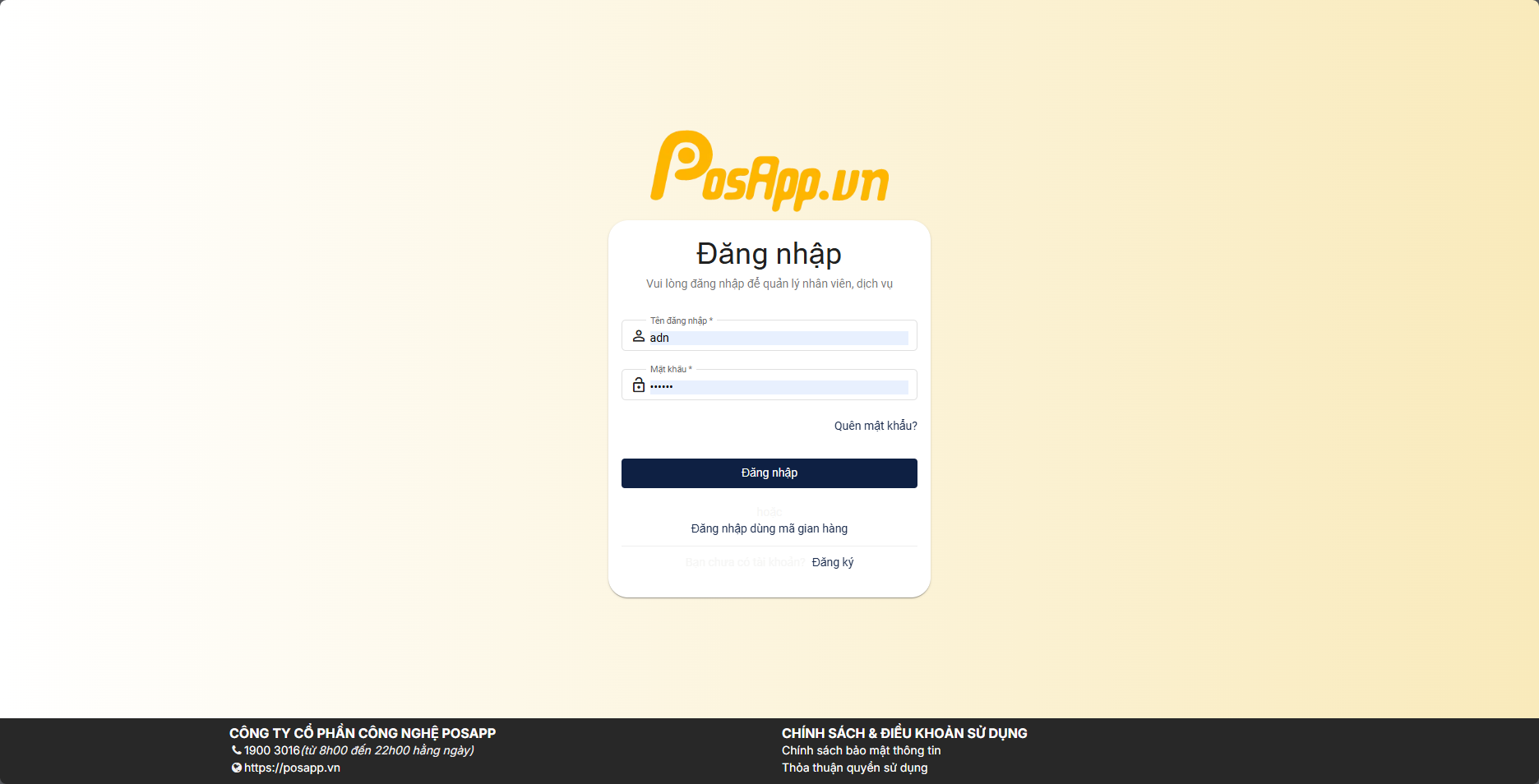Bước 1: Truy cập trang quản trị [PosApp ](https://admin.posapp.vn/) sau đó đăng nhập