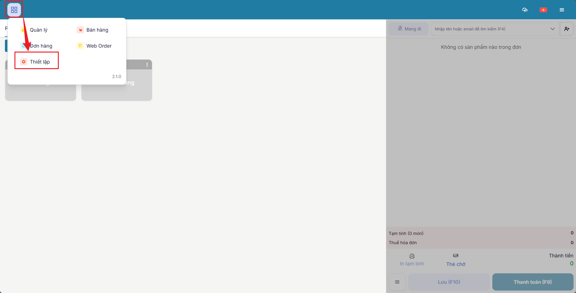 Bước 4: Chọn menu > thiết lập&#x20;