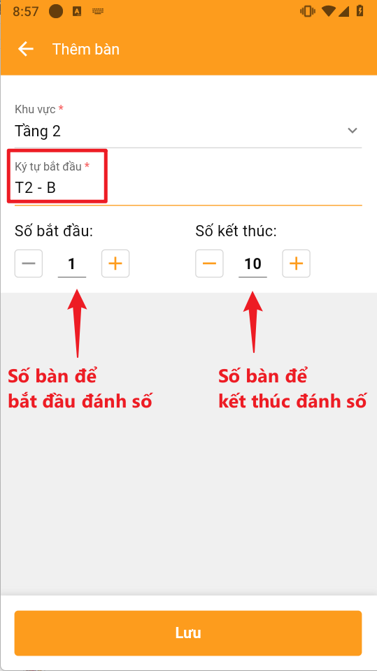 Điền ký tự bắt đầu (các bàn sẽ có ký tự này ở đầu tiên, sau đó số thứ tự sẽ chạy từ số bắt đầu tới số kết thúc)