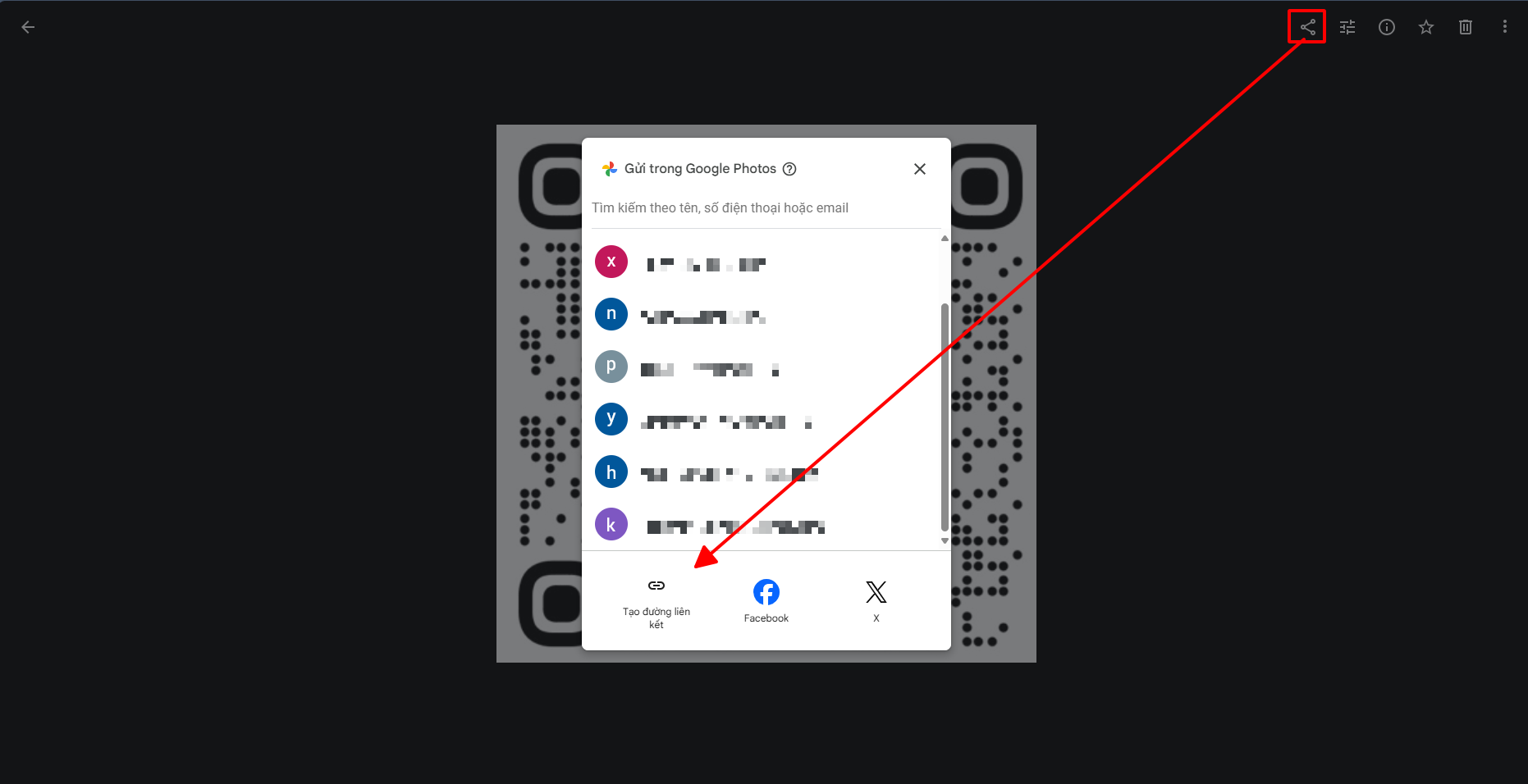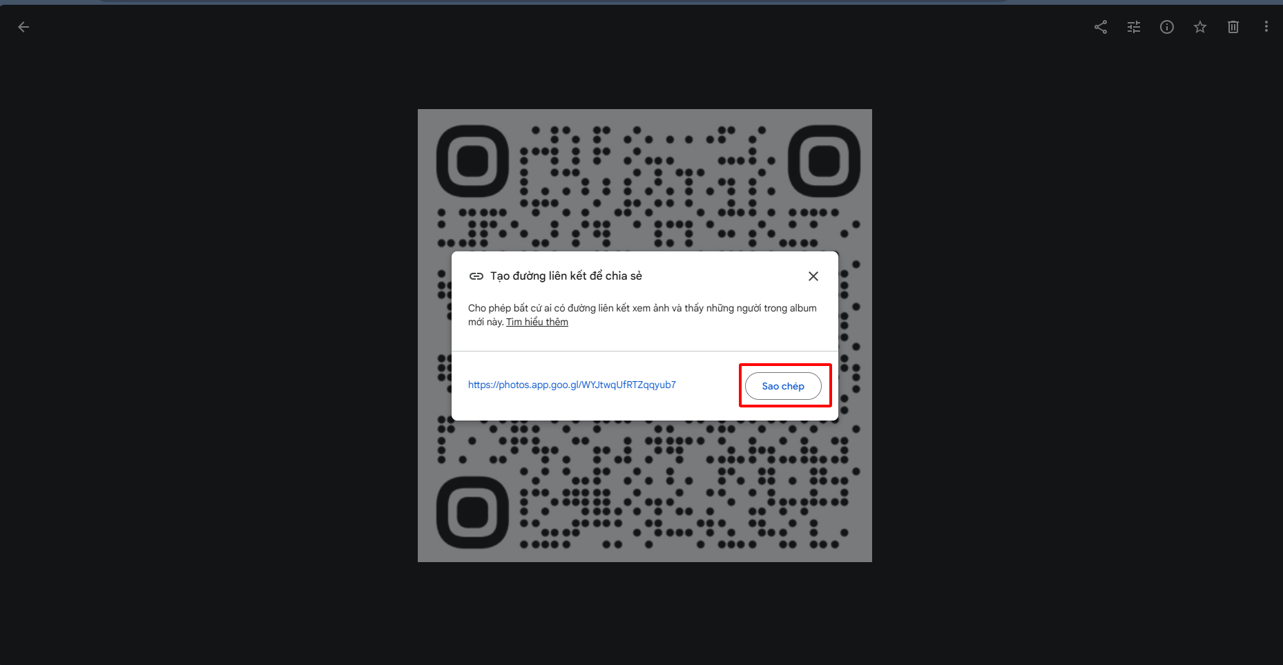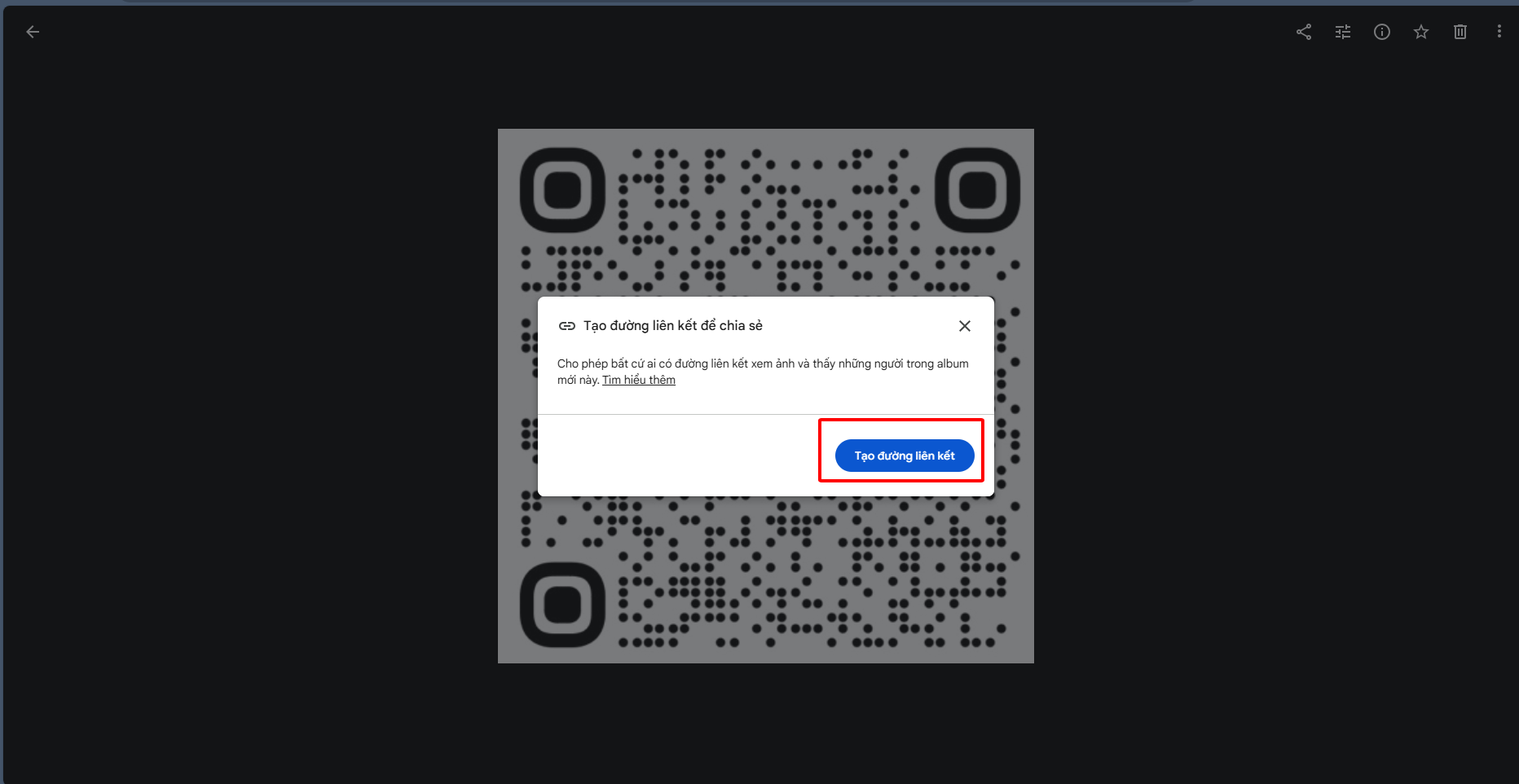 ### 1.2. Mở hình ảnh trên google photo > chọn chia sẻ > chọn tạo đường liên kết