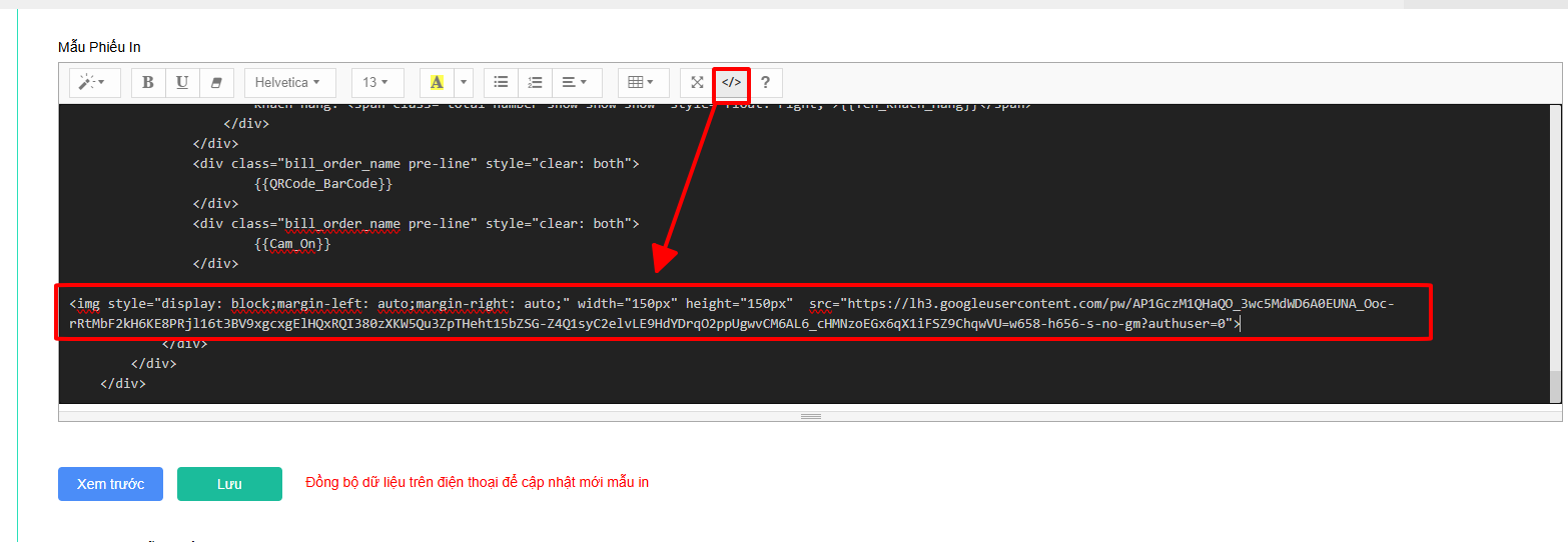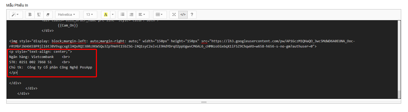 ### 2.1. Sao chép toàn bộ đoạn code hoàn chỉnh và dán ở vị trí muốn thêm QR ở bất kỳ mẫu in nào