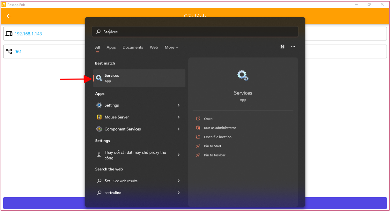 Bước 1: mở thanh tìm kiếm nhập từ khóa services sau đó mở services lên