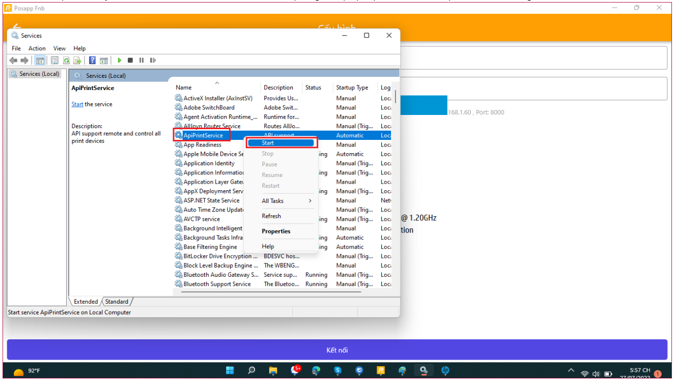 Bước 2: Chuột phải vào ApiPrinterservice sau đó chọn start sau khi chạy xong bạn quay lại phần mềm cài máy in như bình thường