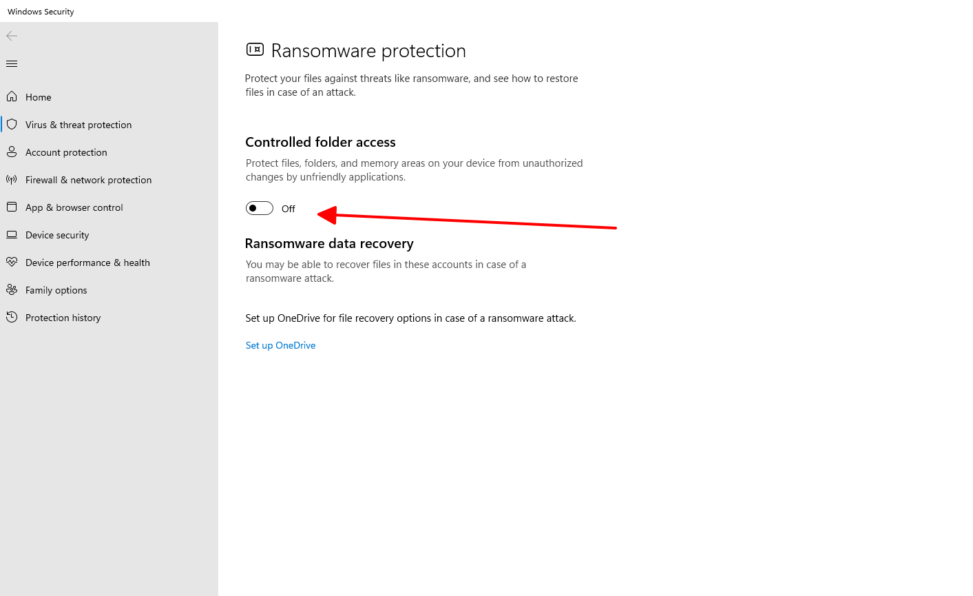 Xử lý: Mở "Setting" nhập từ khóa "Controlled folder access" > enter > Chuyển trạng thái từ ON thành OFF như hình dưới