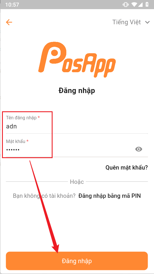 Nhập đầy dủ tên tài khoản, mật khẩu để đăng nhập (hoặc dùng mã pin để đăng nhập)