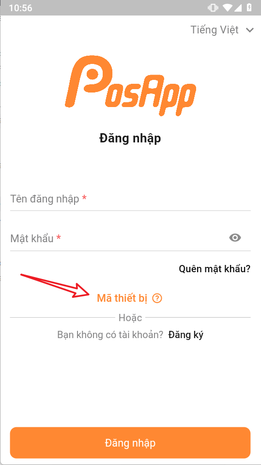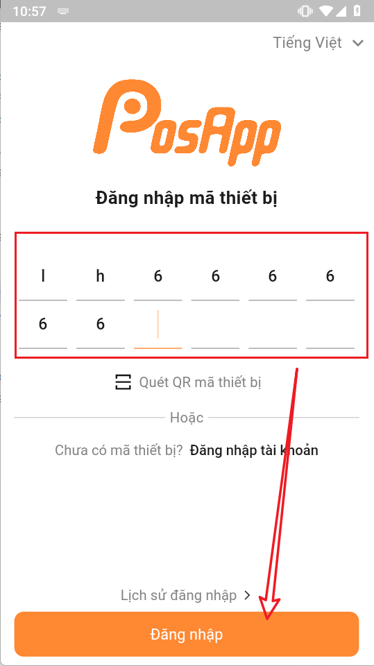 Nhập đầy đủ mã thiết bị > ấn đăng nhập sau đó sẽ được chuyển qua màn hình nhập tài khoản hoặc mã pin