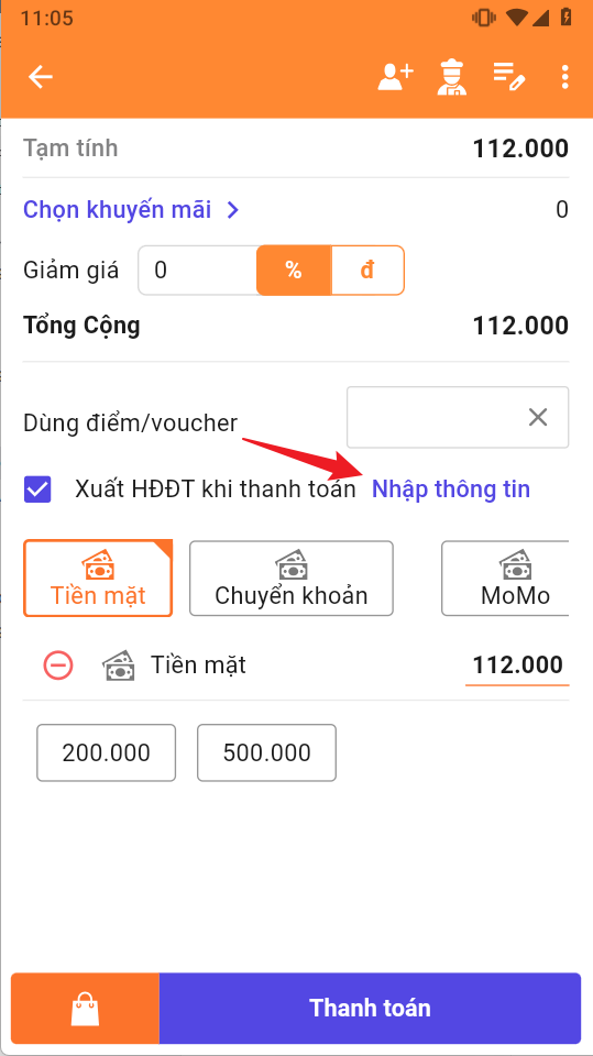Tại mục thanh toán chọn nhập thông tin để nhập thông tin xuất hóa đơn