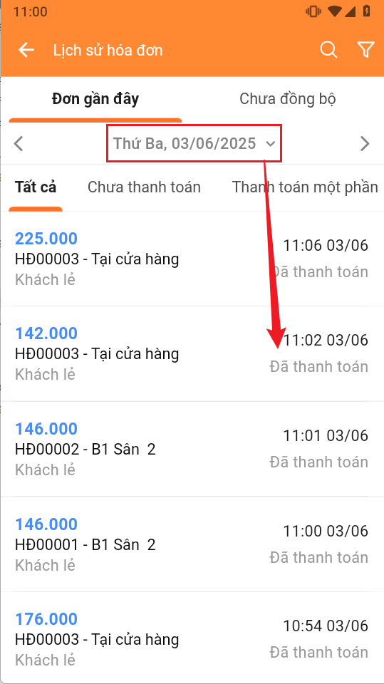 Sau đó lọc ngày cần kiểm kiểm tra > rồi tìm tới đơn hàng muốn xuất hóa đơn