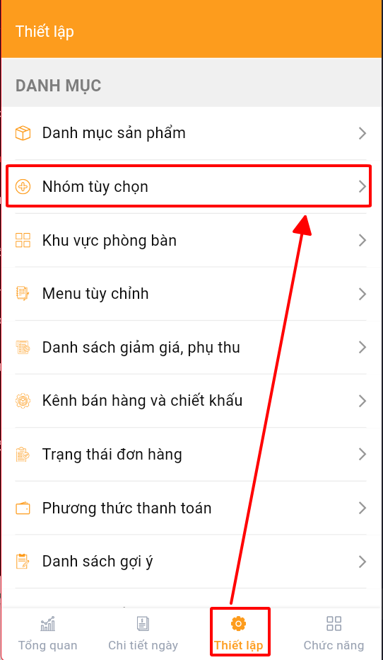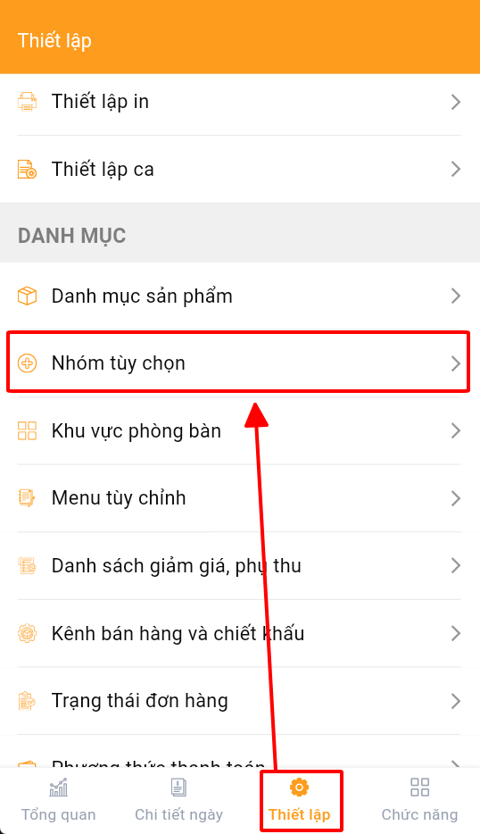 1. Chọn thiết lập > nhóm tùy chọn
