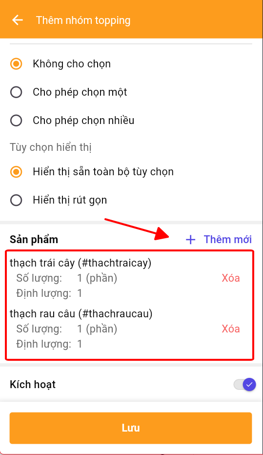 **Tùy chọn hiển thị topping khi ấn vô Sản phẩm**\