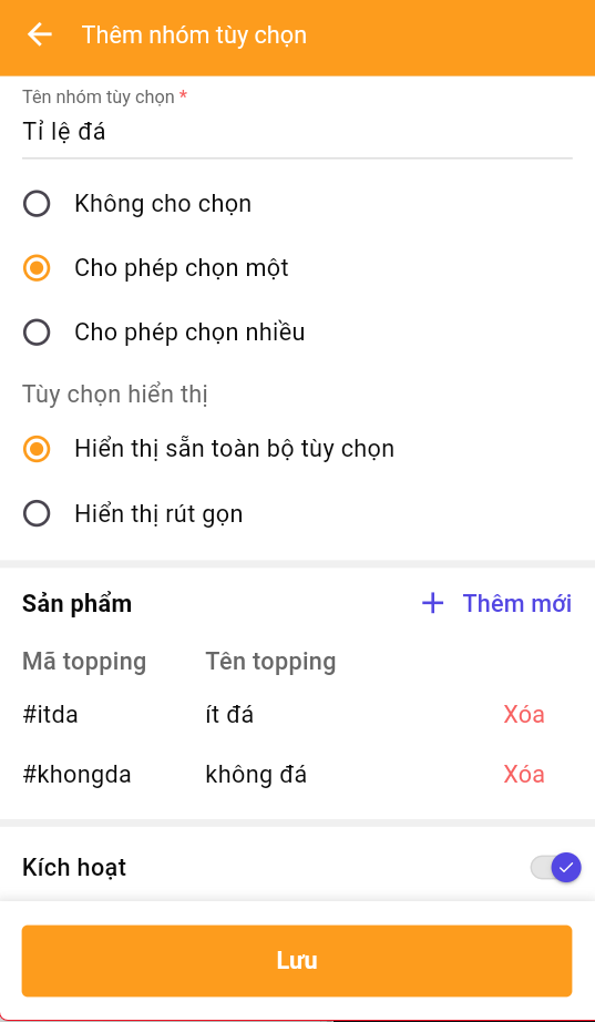 \&#xNAN;**- Không cho chọn:** dành cho các món có topping mặc định.  thì khi order món mặc định các topping có trong danh sách đều tự thêm vào món, khách ko thể bỏ ra\