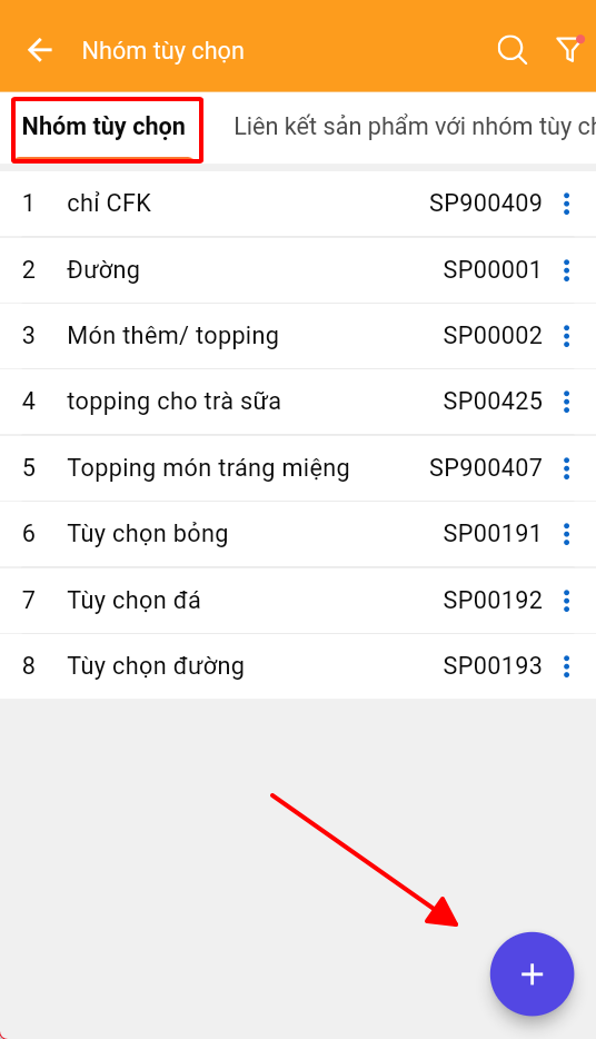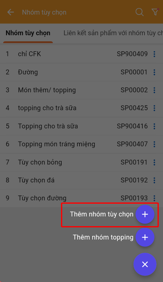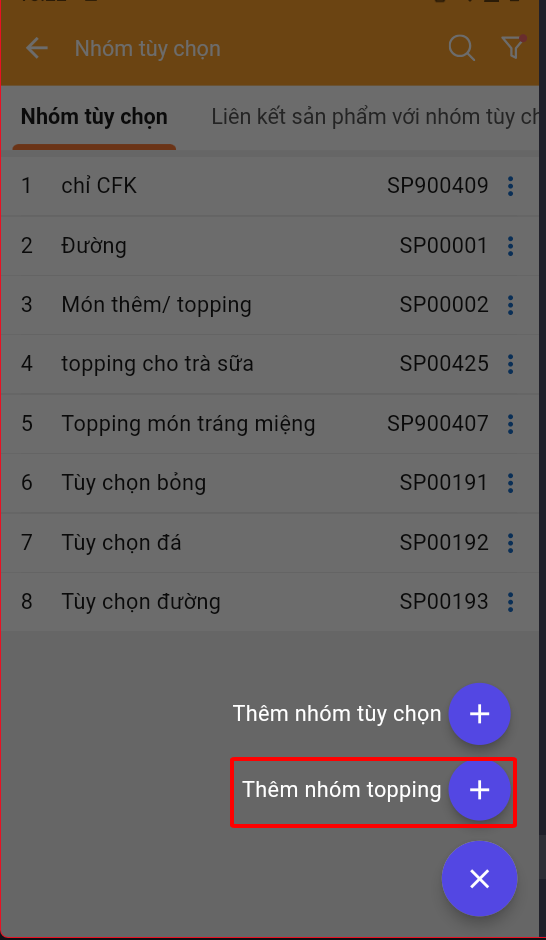 Sau khi tạo được danh sách topping trên phần mềm như hướng dẫn [**Bước 1**](#buoc-1-khoi-tao-topping-tren-posapp-quan-ly) **ta thực hiện gom nhóm cho topping như sau**