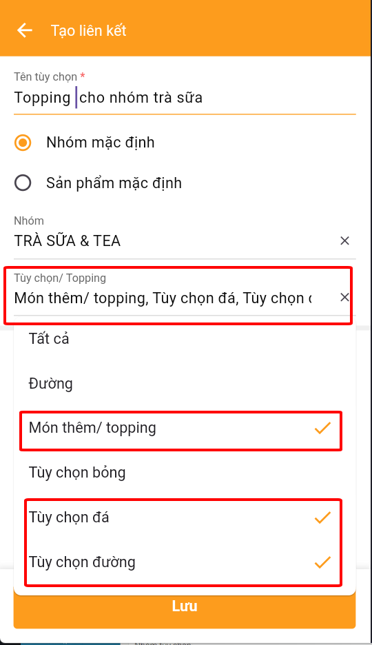 Chọn vào tùy chọn > chọn các topping sẽ áp dụng cho nhóm trà sữa&#x20;