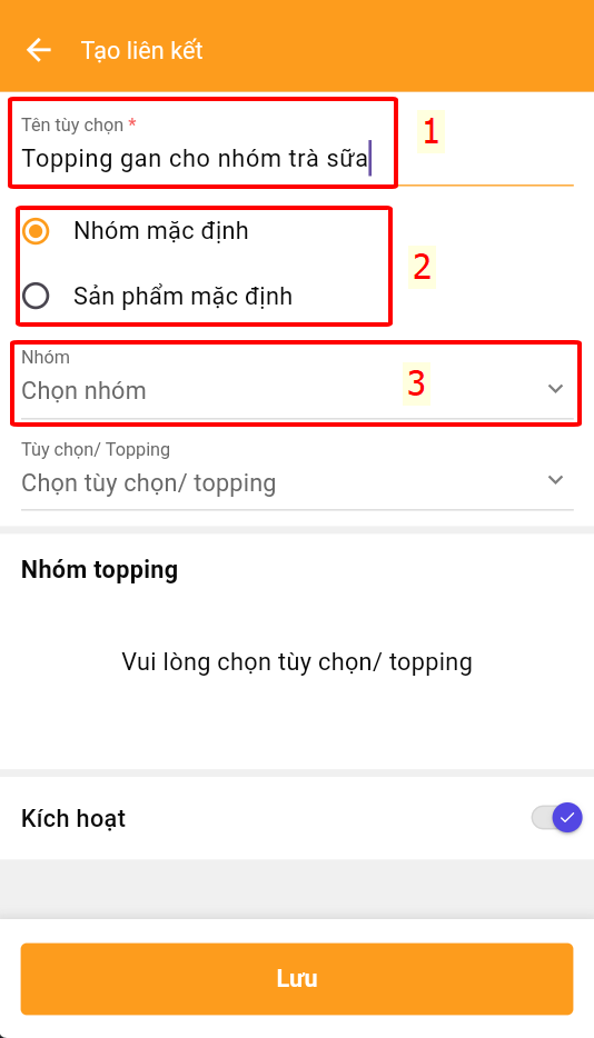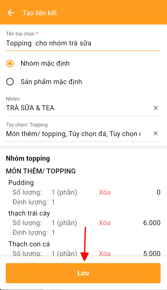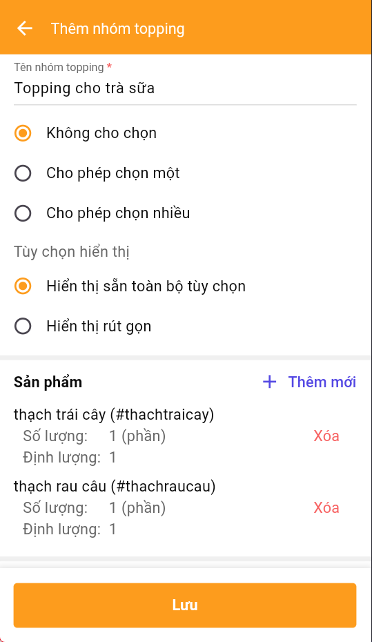 Sau khi hoàn tất thì nhấn lưu là đã tạo thêm 1 nhóm các topping cho trà sữa
