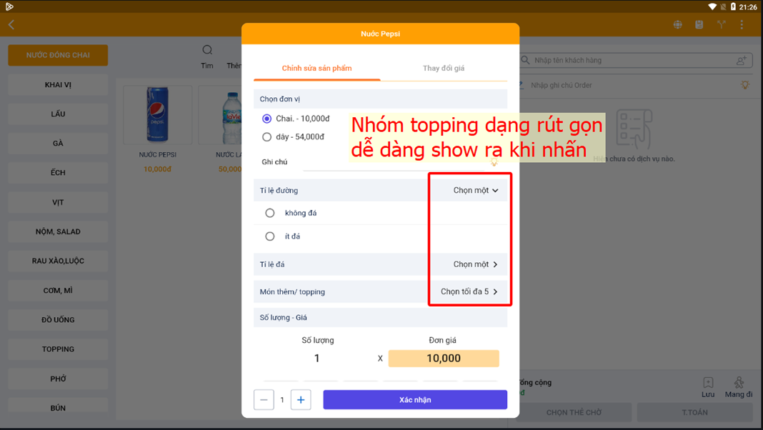 *Topping: là các tùy chọn thêm có tính phí (ví dụ topping thạch cho món ăn)*