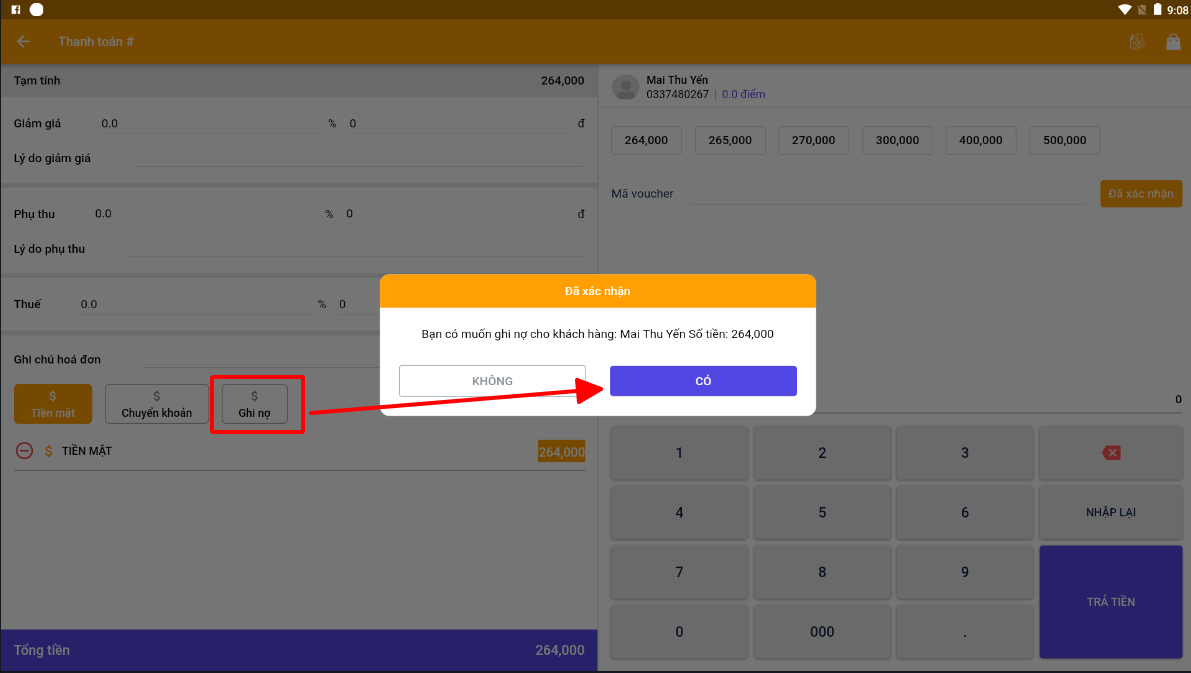 Tiếp theo ấn ghi ghợ > thì số tiền còn lại sẽ được hỏi có muốn ghi nợ cho khách hàng không
