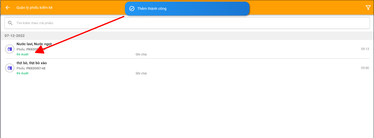 Các mặt hàng chọn được thêm vào phiếu kiểm kê trong đó