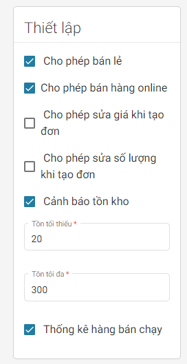 | <img src="https://content.gitbook.com/content/Gu5oyTfAF1pzDKa0KLxL/blobs/70EGm9oKg6hFxBIVwqaO/4" alt="" data-size="original"> | <p>- Tắt cho phép bán lẻ nếu NVL đó không nằm trong danh sách Sản phẩm bán</p><p>- Cho phép bán hàng online: NVL sẽ xuất hiện tại web bán hàng online như grab, web order, ...</p><p>- Cho phép sửa giá và số lượng khi tạo đơn: không bán lẻ NVL thì không cần tích</p><p>- Cảnh báo tồn kho: để cảnh báo khi sl tồn kho nằm ngoài mức cảnh báo</p><p>- Thống kê hàng bán chạy: không bán lẻ NVL thì không cần tích</p> |