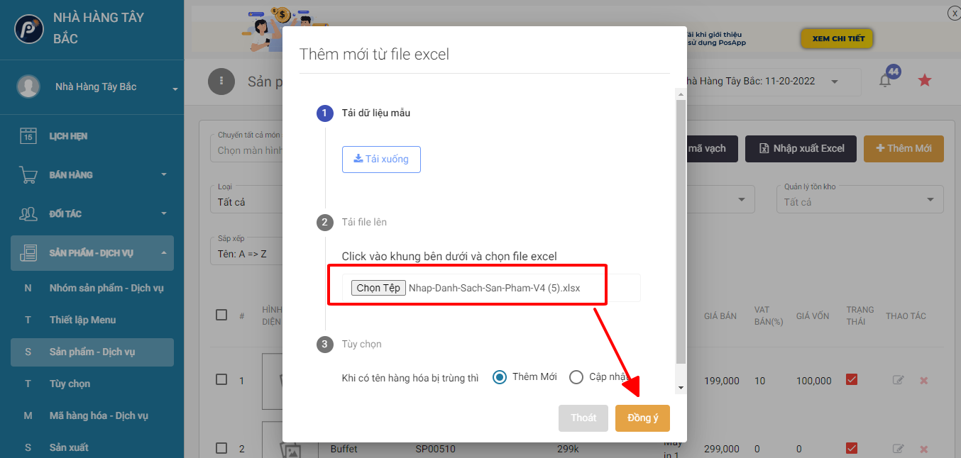 Truy cập [Admin.posapp.vn](https://admin.posapp.vn/) > Sản phẩm - dịch vụ > Sản phẩm - dịch vụ > nhập xuất Excel > Nhập hàng hóa