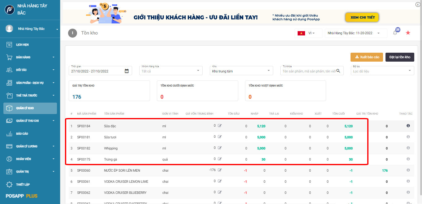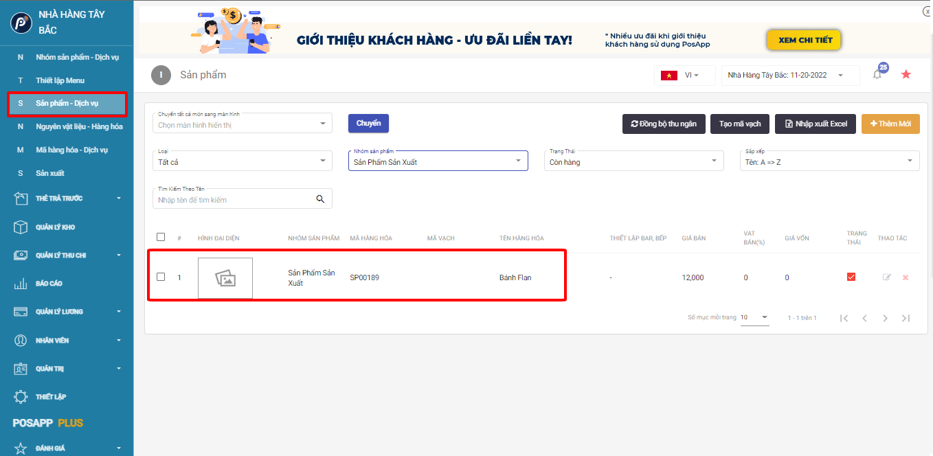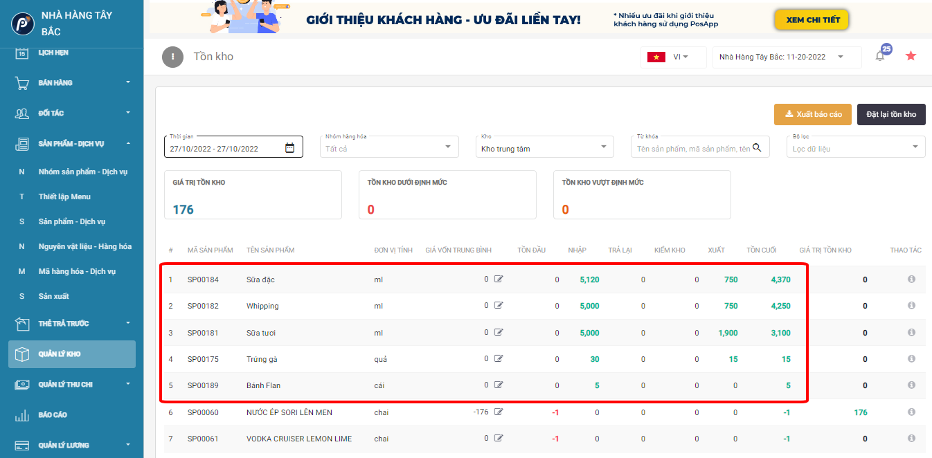 **Bước 13:** Vào quản lý kho sẽ thấy các NVL tiêu hao cho 5 cái bánh Flan đã được trừ, kho xuất hiện tồn kho Bánh Flan SL 5 mà ta mới sản xuất > bán hàng bánh Flan sẽ trừ số lượng này