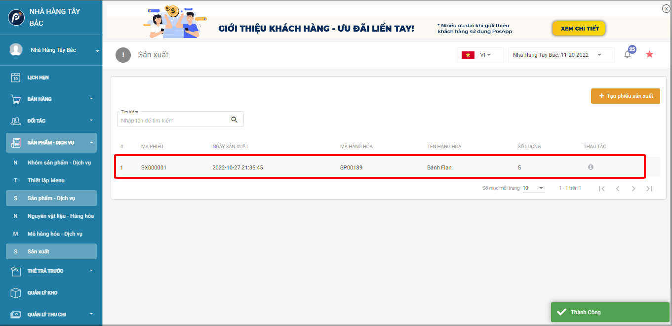 **Bước 12:** Khi nhấn lưu sẽ báo thành công và thống kê các phiếu sản xuất bên dưới (tồn kho bánh Flan đã xuất hiện trong kho)